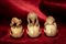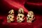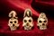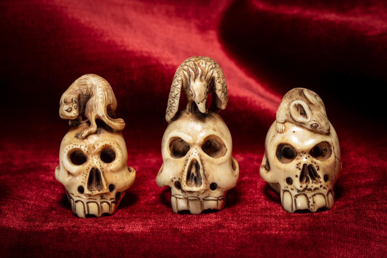 Tre netsuke in avorio intagliato e traforato a guisa di teschi sormontati da un topolino, un'aquila e una volpe. Giappone, periodo Meiji (1868-1912)