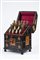 Composto da sei coltelli, sei forchette e sei cucchiaini con presa scanalata e terminante a volute con punzone dell' argentiere "GC" non identificato (668 g). Il cofanetto decorato da riquadri con scena di caccia e soldati entro cornici con rosoni, profilo inferiore con cornice guillochè, piedi a cipolla e maniglia ad anello (difetti e restauri)