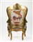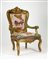 Poltrona in legno intagliato e dorato, cimasa e fascia centrate da valva di conchiglia tra volute, braccioli e piedi terminanti a ricciolo. Secolo XIX.