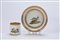 Porcellana bianca con bordure in oro decorata in policromia con scena di caccia al cervo nel cavetto del piattino e con due uccelli in uno stagno nella tazzina. Marca "N coronata in blu" con etichetta cartacea di provenienza Lukacs-Donath Antichità Roma sotto la baseTazza cilindrica con ansa sagomata, piattino rotondo con alta tesa.