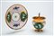 porcellana dipinta in policromia e oro a trofei entro riserve rosa e con losanghe verdi centrate da vasi e da amorino alato su biga trainata da cignoporcellana dipinta in policromia e oro a trofei entro riserve rosa e con losanghe verdi centrate da vasi e da amorino alato su biga trainata da cigno