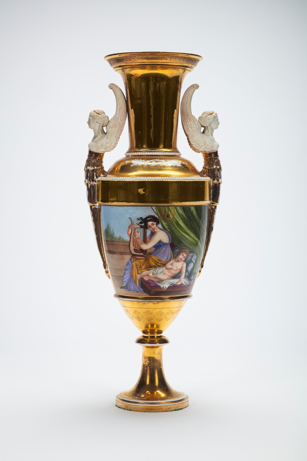 corpo ovoidale su alto piede decorato in policromia da scena neoclassica raffigurante figura femminile con lira e putto in un interno. Anse in biscuit in forma di sfingi corpo ovoidale su alto piede decorato in policromia da scena neoclassica raffigurante figura femminile con lira e putto in un interno. Anse in biscuit in forma di sfingi