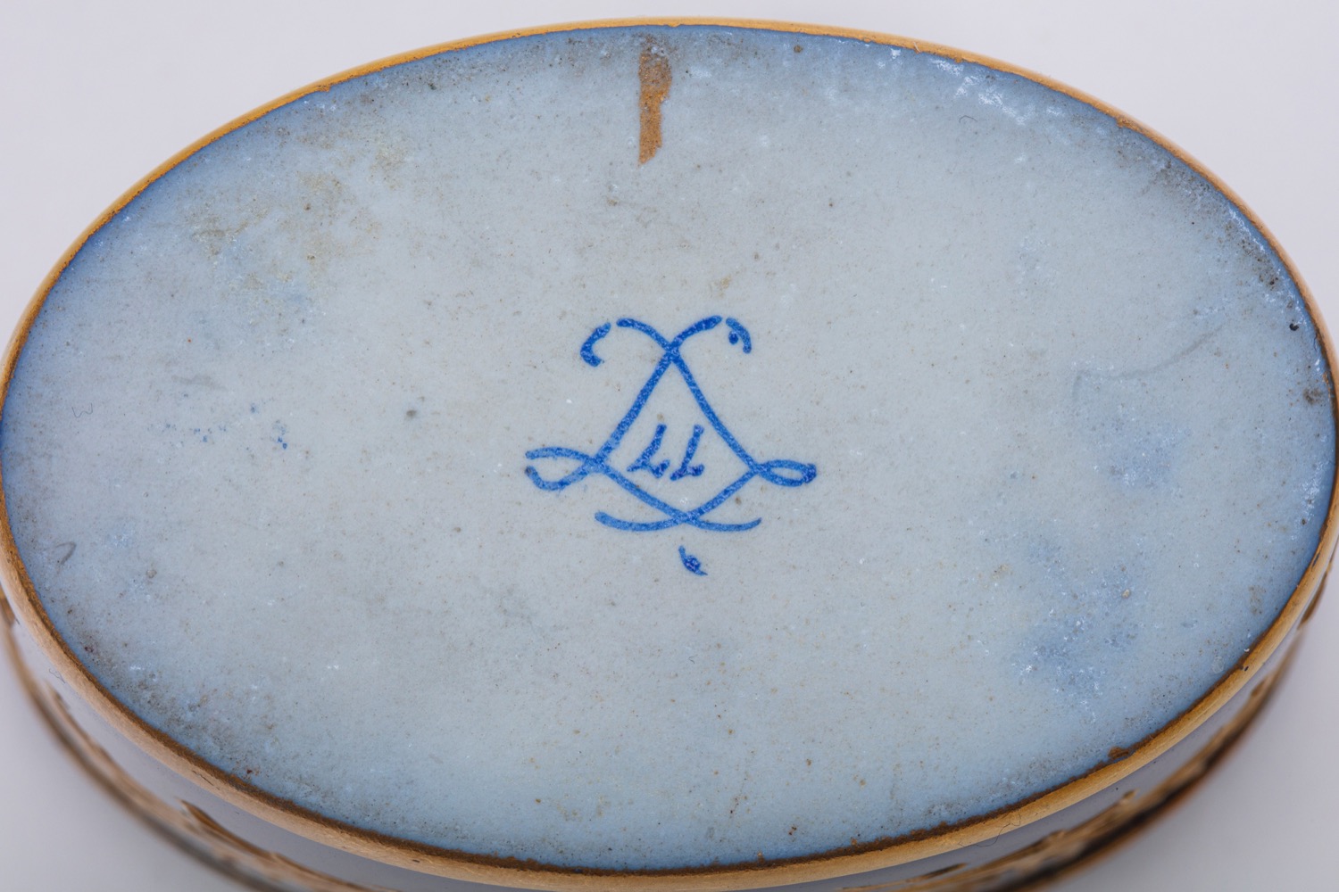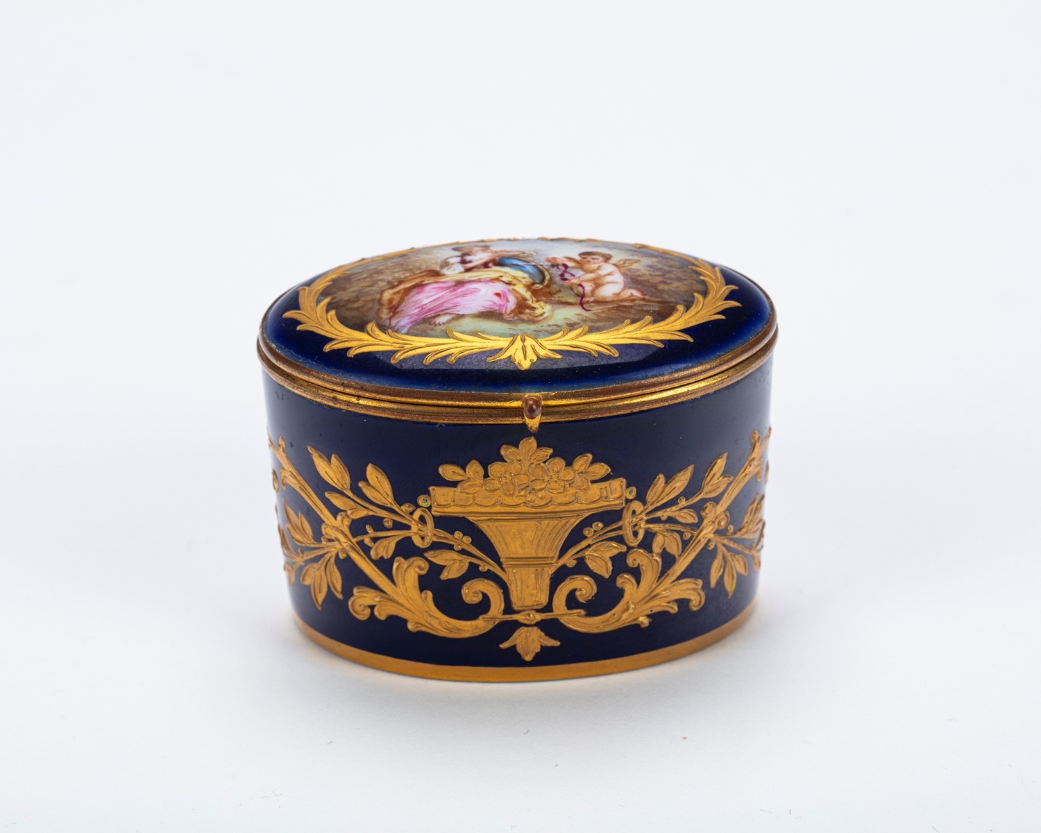 Marca sotto la base.Di forma ovale in porcellana a fondo blu decorata sul coperchio con riserva policroma raffigurante dama e amorino in un paesaggio. Sulla fascia vaso di fiori tra volute fogliate e motivo a valva di conchiglia in oro e a rilievo.