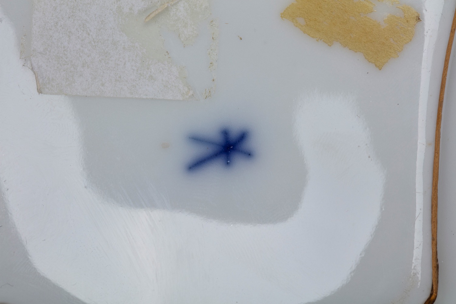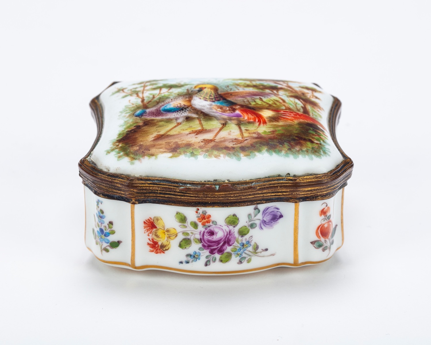 di forma mossa decorata in policromia a bouquet di fiori lungo i bordi e a fagiani in un paesaggio agreste sul coperchio. Marca di fabbrica.di forma mossa decorata in policromia a bouquet di fiori lungo i bordi e a fagiani in un paesaggio agreste sul coperchio. Marca di fabbrica.