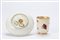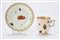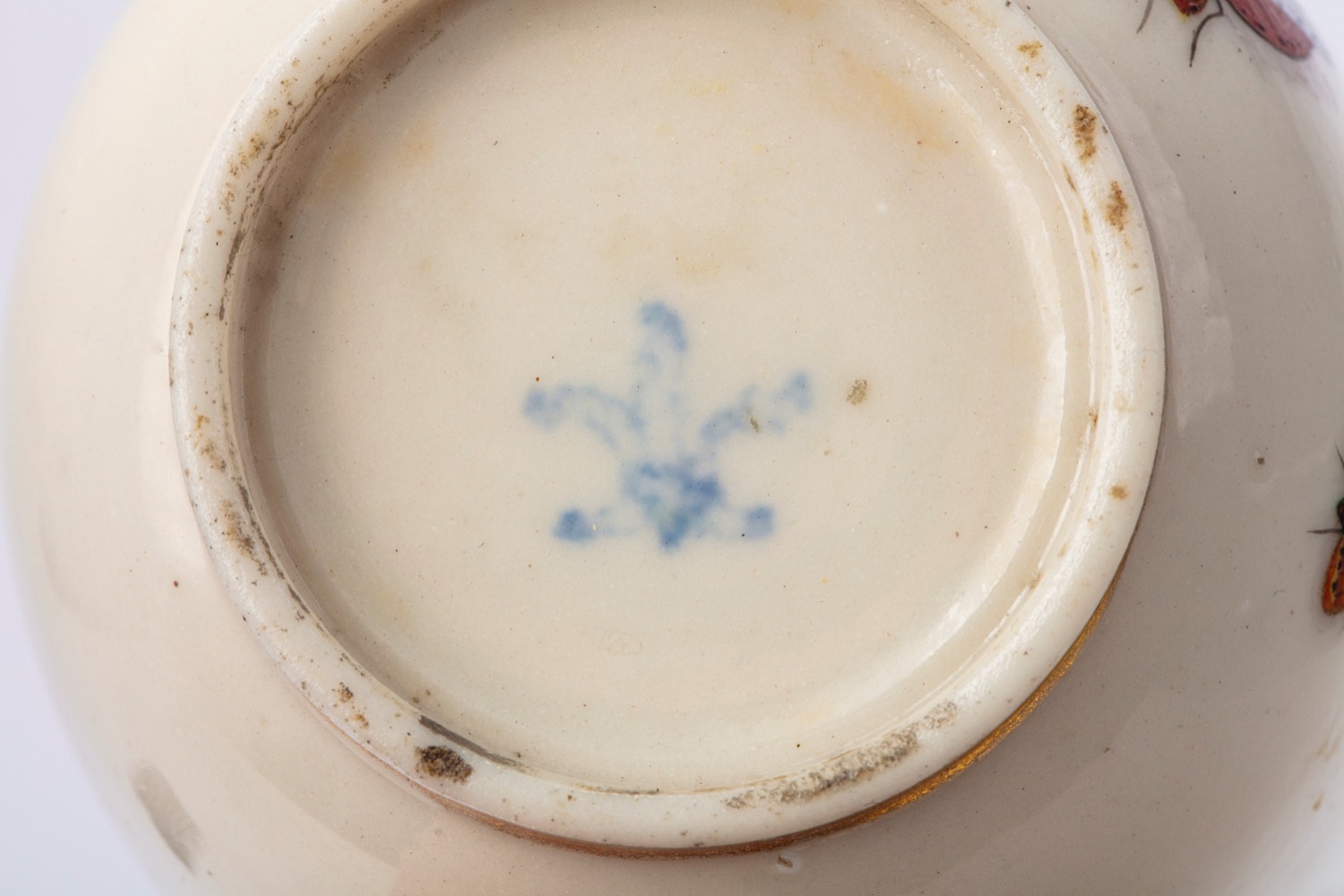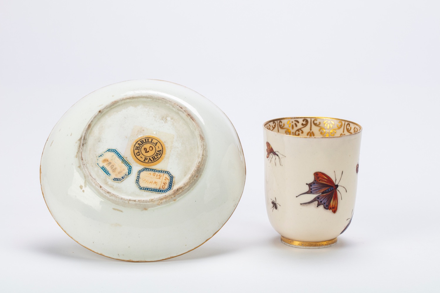 Rara tazza con piattino in porcellana con decoro policromo a farfalle e insetti. Manifattura di Capodimonte, 1750 circa