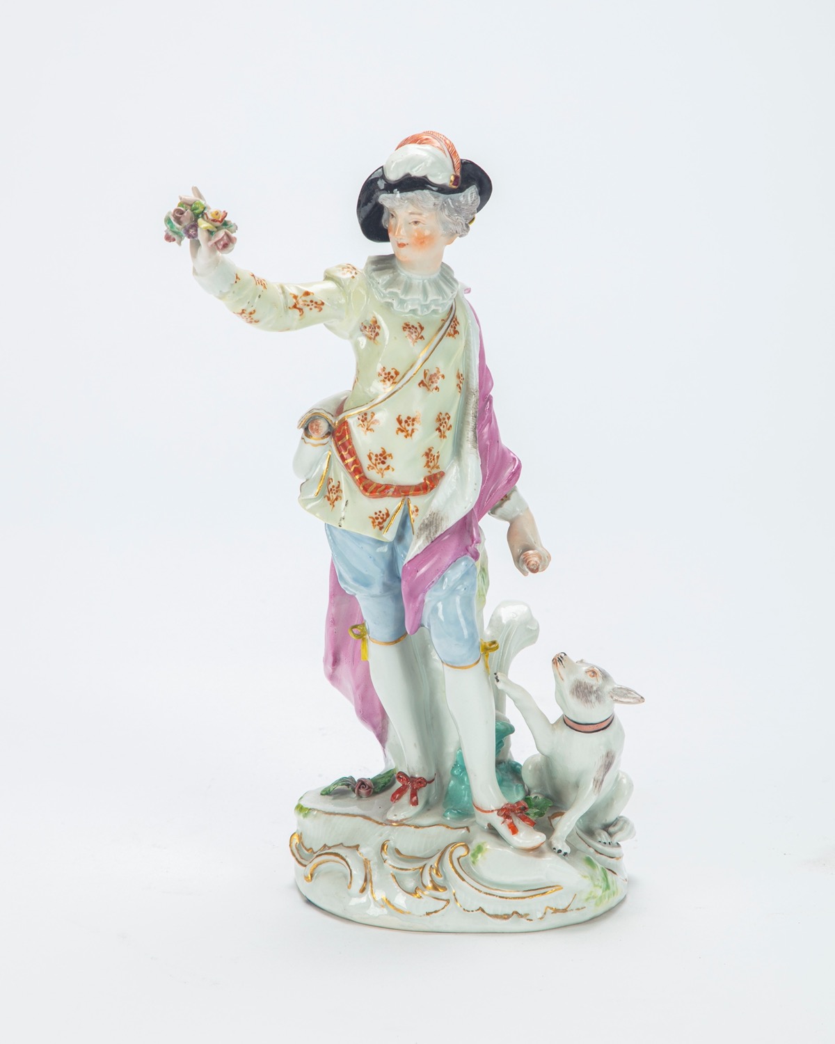 Cavaliere con cane in porcellana. Manifattura di Meissen, inizio XIX secolo