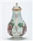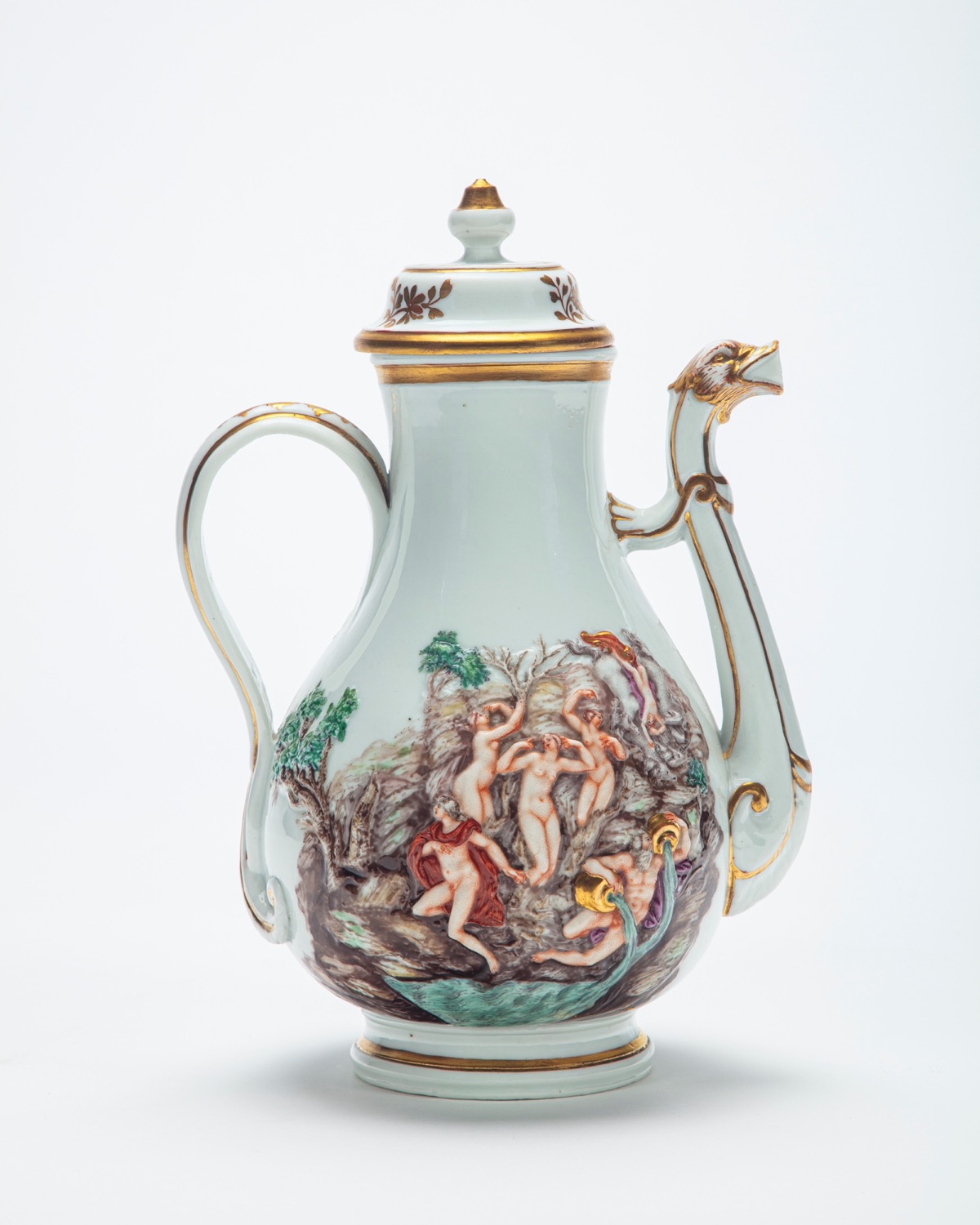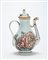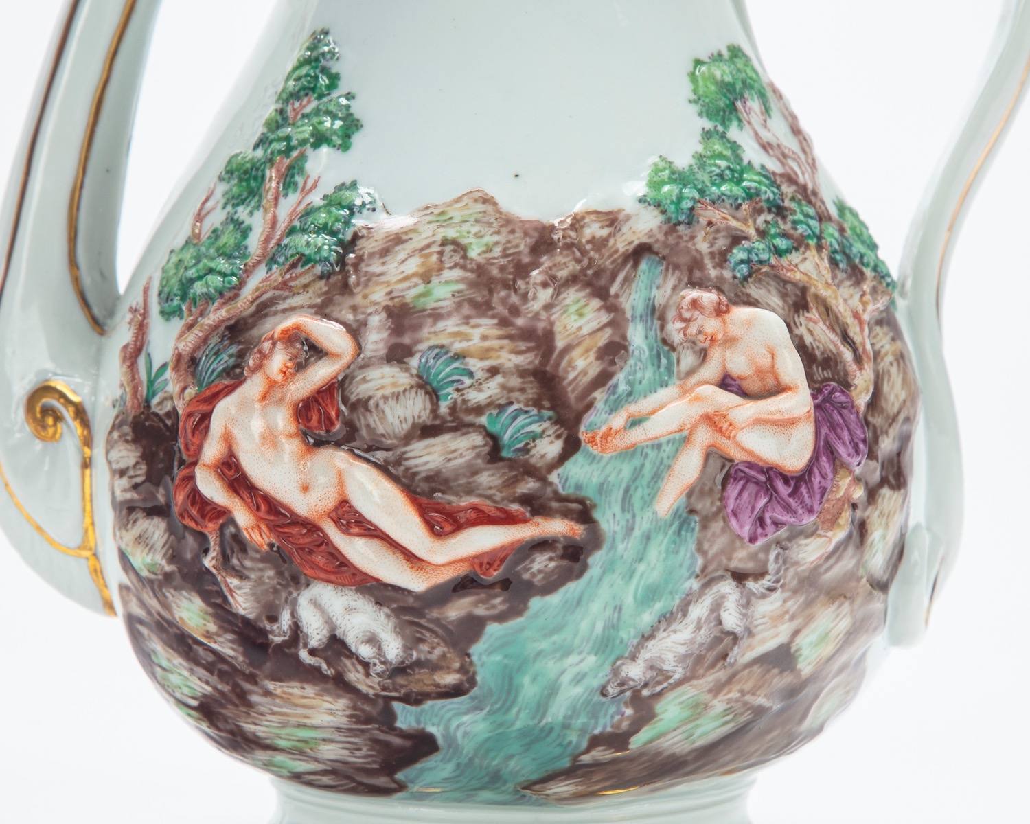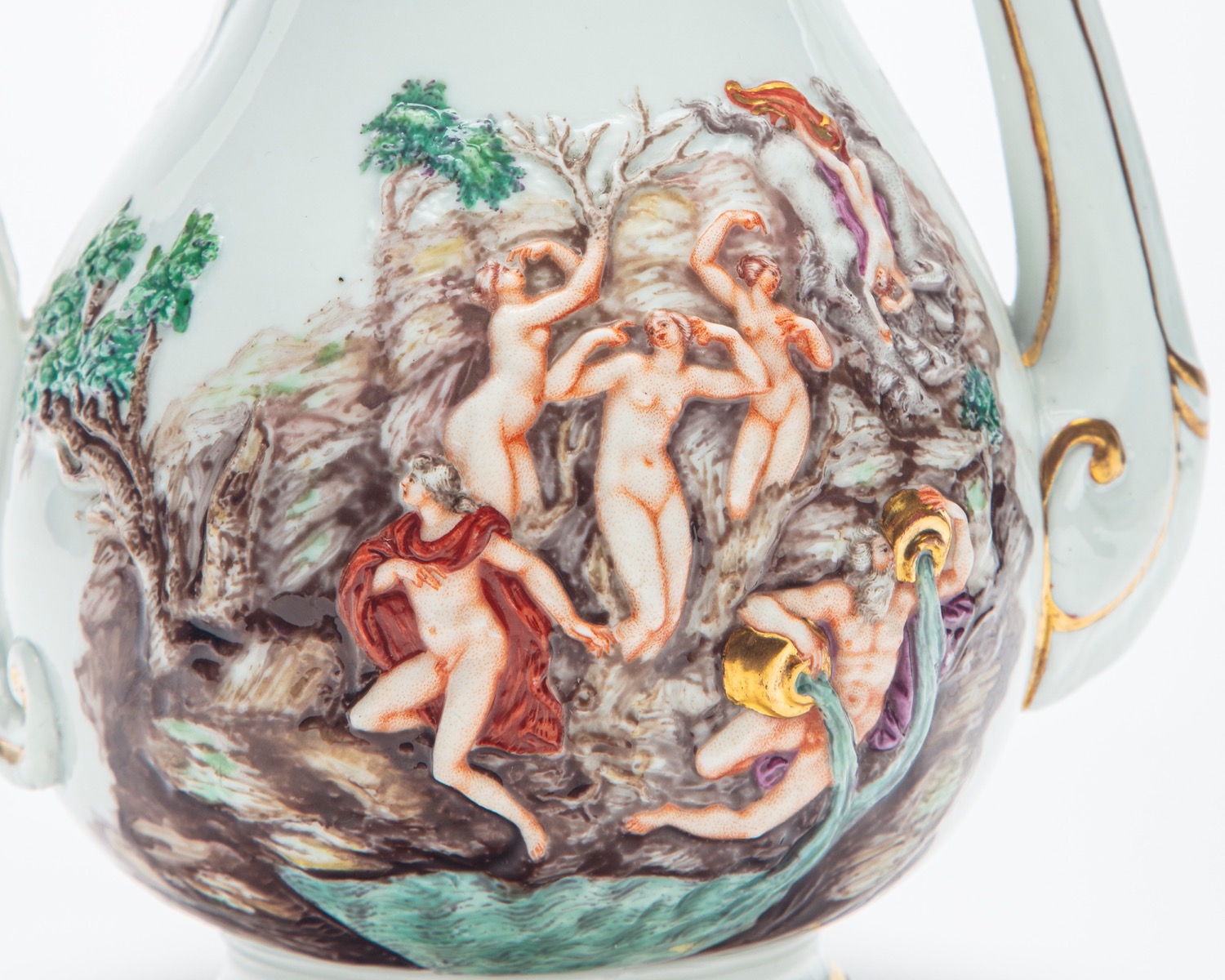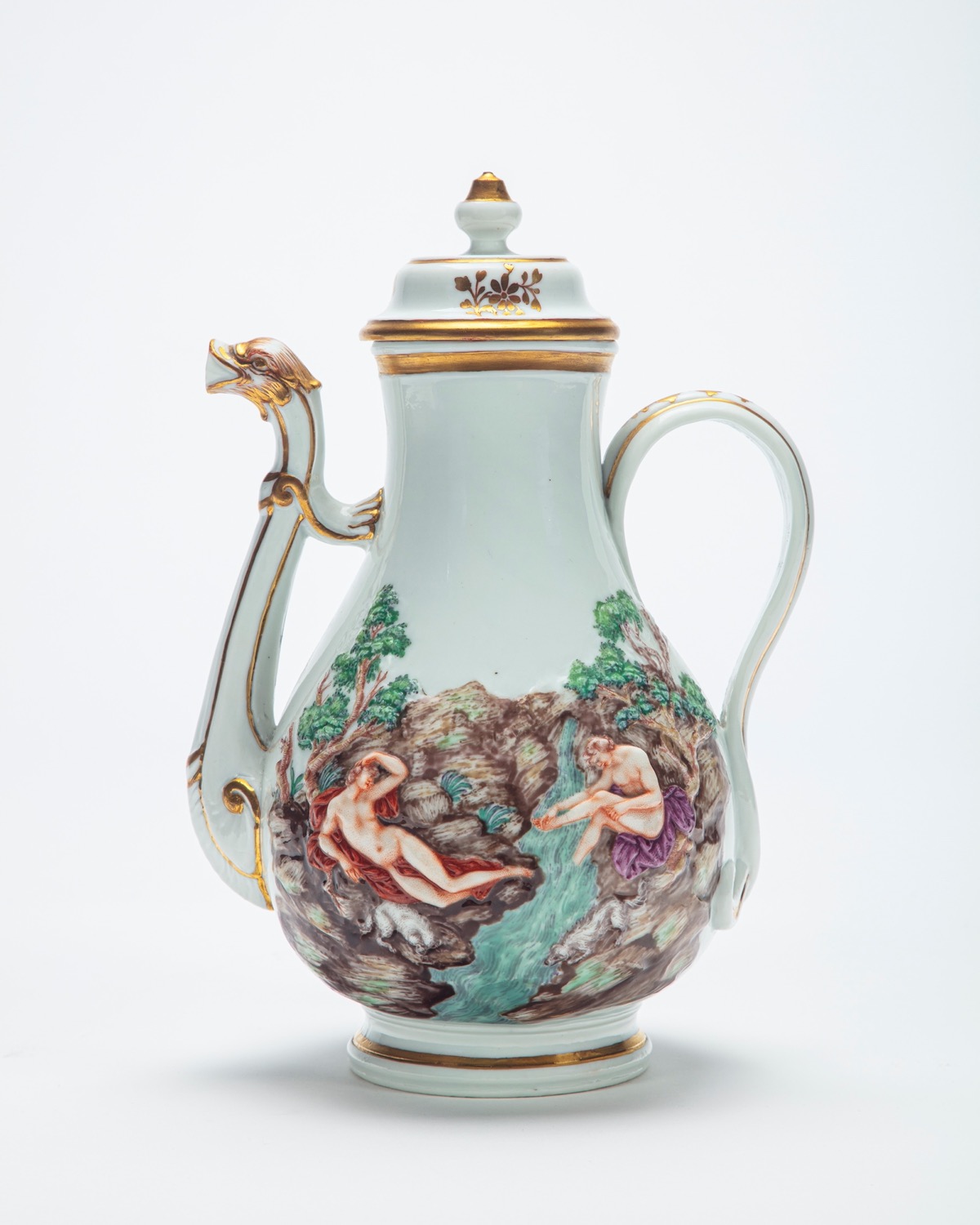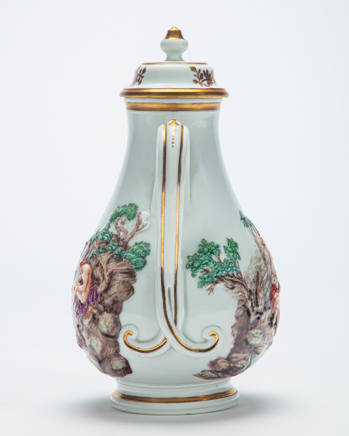 Importante caffettiera in porcellana decorata in policromia a bassorilievi istoriati. Manifattura Ginori, Doccia, 1770-1780