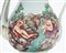 Corpo piriforme su piede modanato, versatoio zoomorfo a testa di anatra, presa del coperchio a trottola, ansa ad anello con doppia voluta intrecciata all'attaccatura. Profilata in oro e decorata in policromia a "bassorilievi istoriati" raffiguranti il mito di Apollo e Dafne.