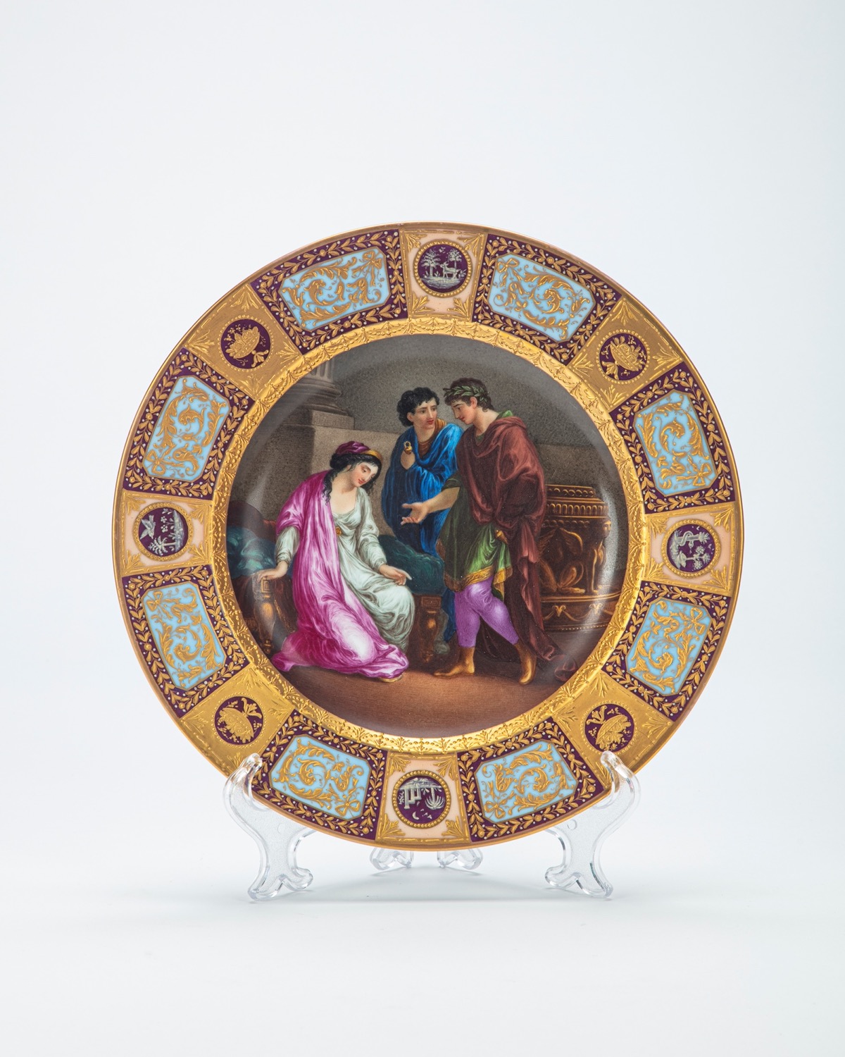 Il cavetto con scena classica da Angelica Kauffmann raffigurante Cleopatra davanti a Cesare alla presenza di un cortigiano in un interno di palazzo con basamento a sfingi alate, la tesa con riserve decorate a volute fogliate alternate a medaglioni. Marca di fabbrica.Il cavetto con scena classica da Angelica Kauffmann raffigurante Cleopatra davanti a Cesare alla presenza di un cortigiano in un interno di palazzo con basamento a sfingi alate, la tesa con riserve decorate a volute fogliate alternate a medaglioni. Marca di fabbrica.