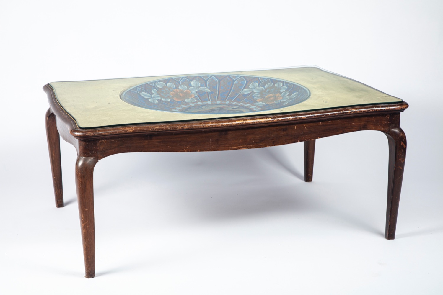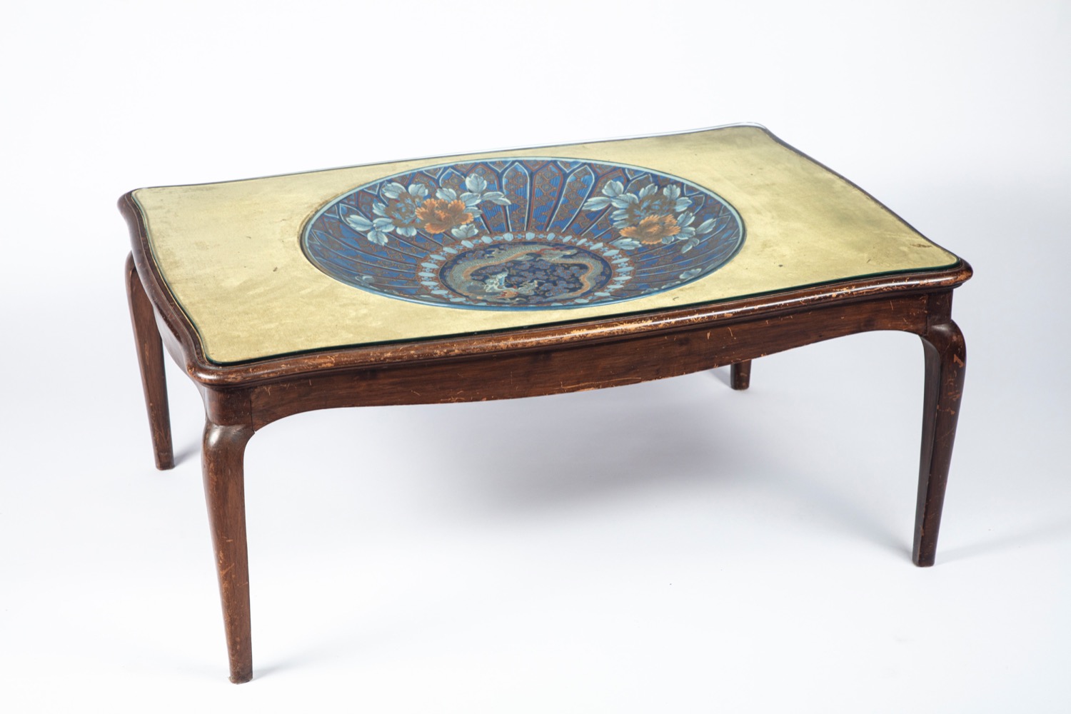 li cavetto decorato con dragone, la balza con motivi radiali e floreali. Montato in un tavolino da salotto in legno intagliato (cm 98x42x68)li cavetto decorato con dragone, la balza con motivi radiali e floreali. Montato in un tavolino da salotto in legno intagliato (cm 98x42x68)