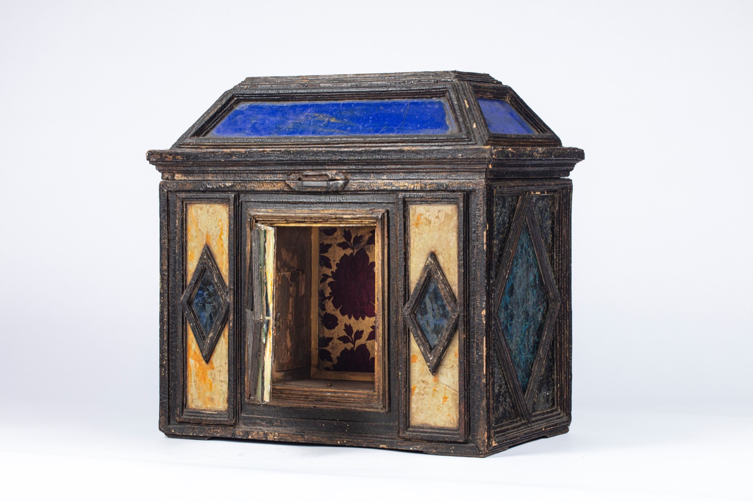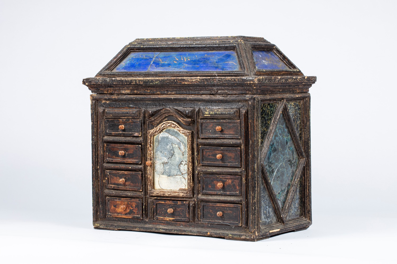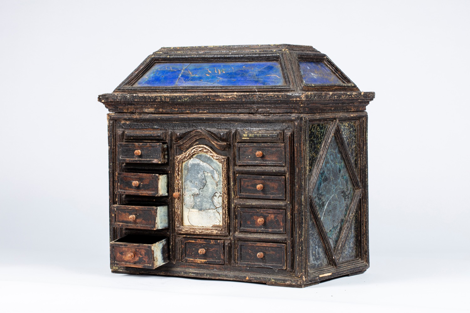 Stipo monetiere da centro in legno ebanizzato e vetri policromi, secolo XVII