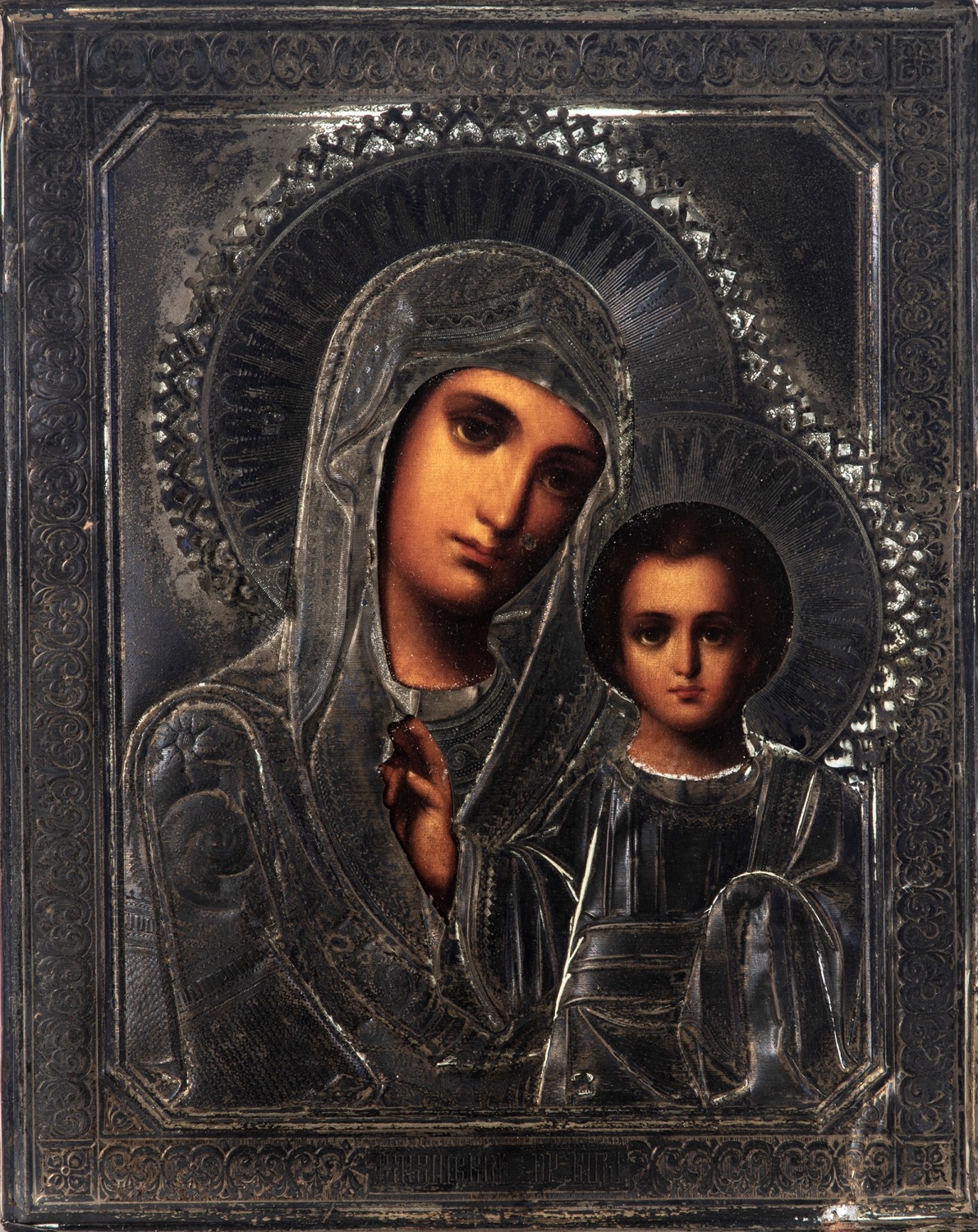Icona raffigurante Madonna di Kazan, tempera su tavola con riza in argento. Russia, inizio secolo XX