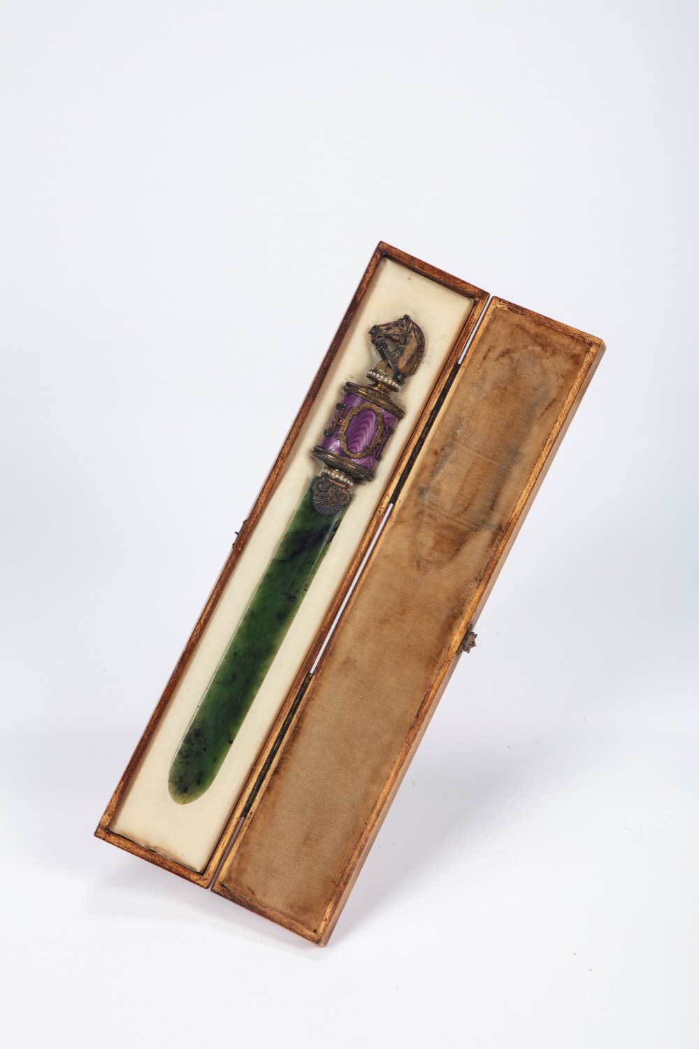 Tagliacarte in argento dorato, nefrite e smalto. San Pietroburgo, 1882-1899