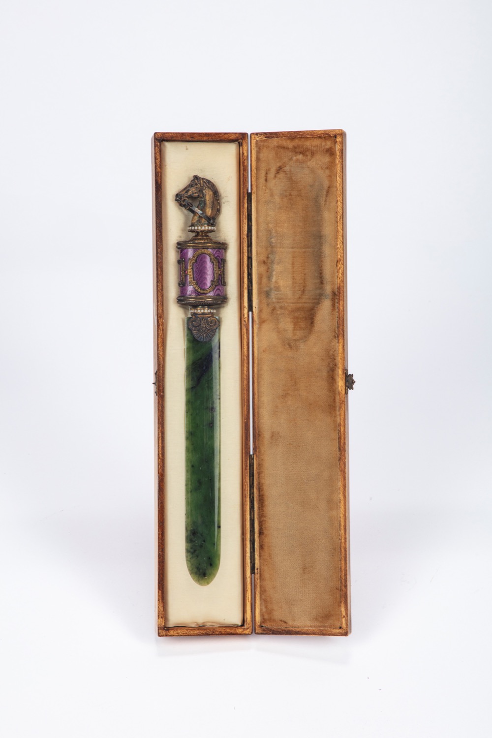 la lama in nefrite con motivo a palmetta con volute all'attaccatura, l'impugnatura in smalto rosa decorata con fregi a riserve e sormontata da testa di cavallo. Punzoni di San Pietroburgo, 1882-1899 (lieve difetto allo smalto) Entro scatola in legno la lama in nefrite con motivo a palmetta con volute all'attaccatura, l'impugnatura in smalto rosa decorata con fregi a riserve e sormontata da testa di cavallo. Punzoni di San Pietroburgo, 1882-1899 (lieve difetto allo smalto) Entro scatola in legno