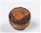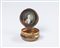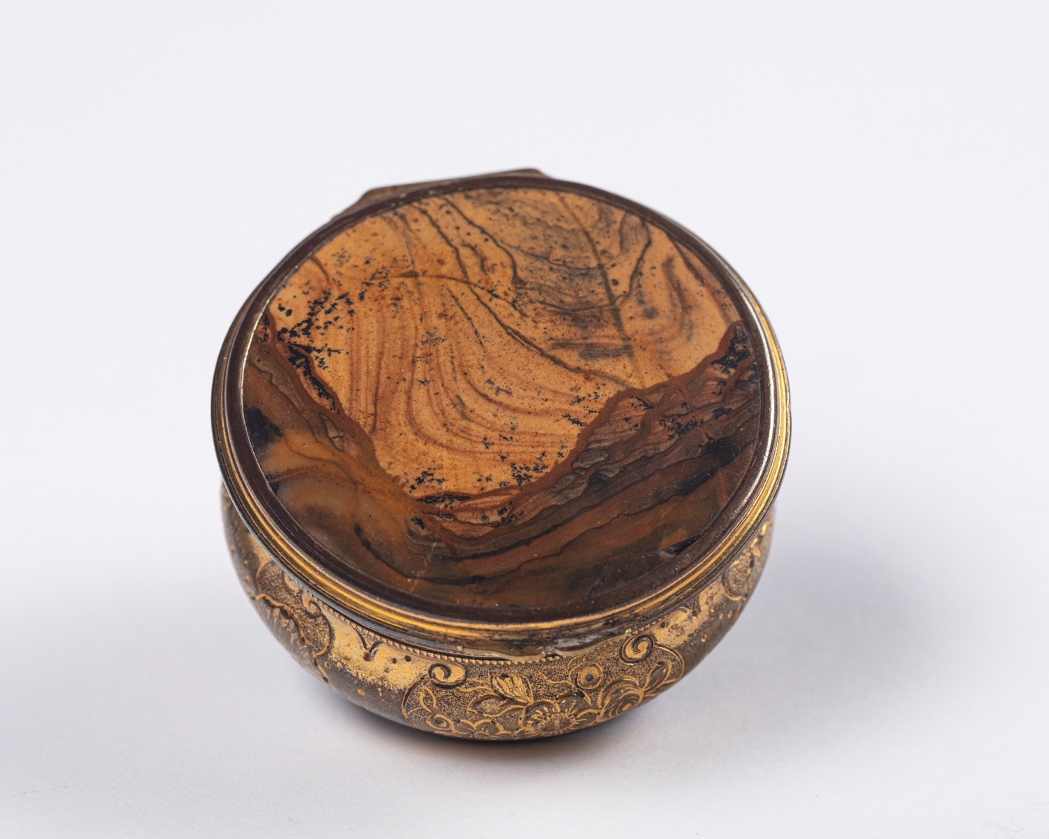 Tabacchiera di forma circolare con coperchio e base in agata montata in metallo dorato cesellato a volute, motivi floreali e valve di conchiglia. Inghilterra, metà del secolo XVIII