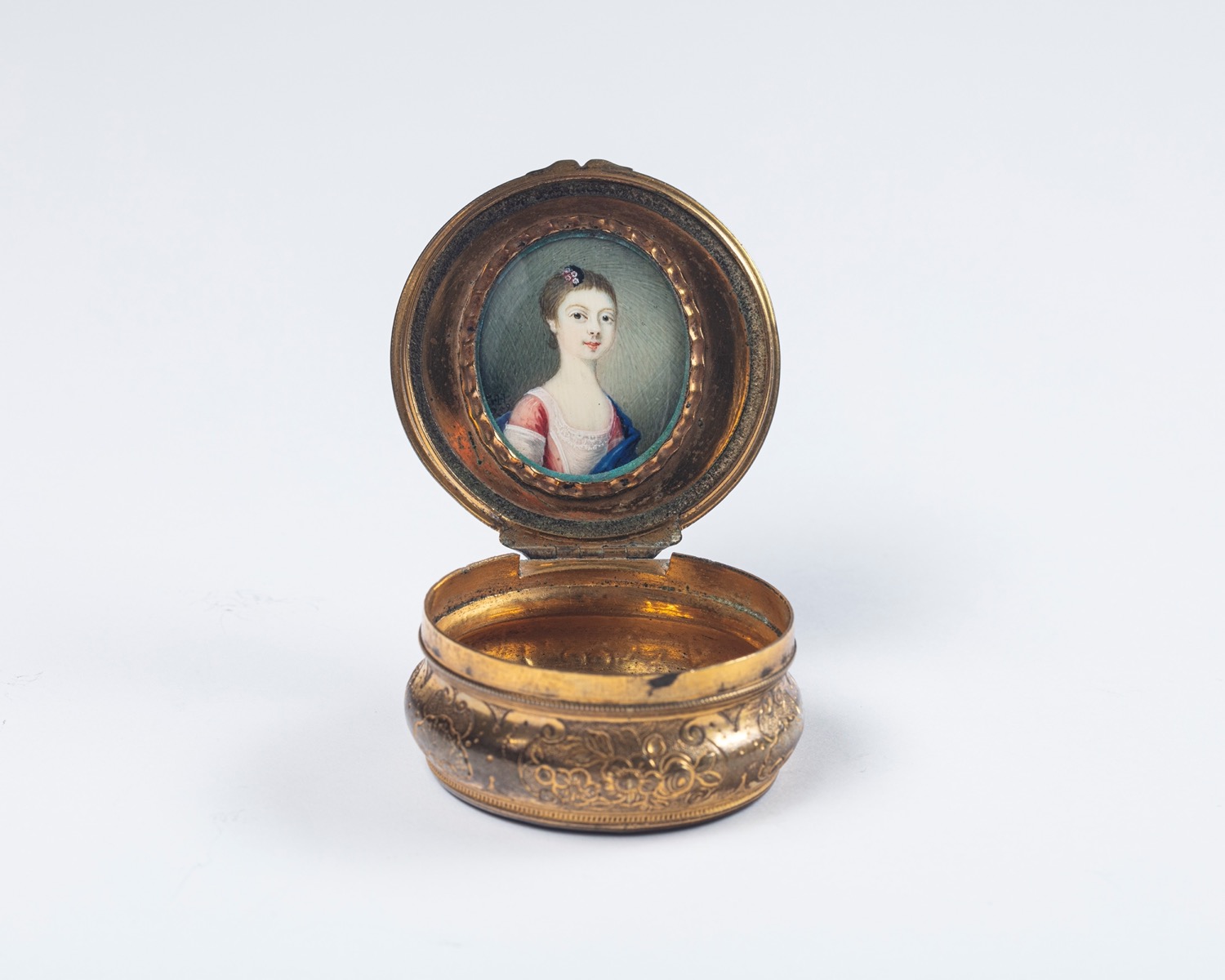 All’interno del coperchio miniatura ovale su avorio raffigurante fanciulla in abito rosso con manto blu, firmata con monogramma e datata “G.H 759”. Piccoli difetti sul coperchio.