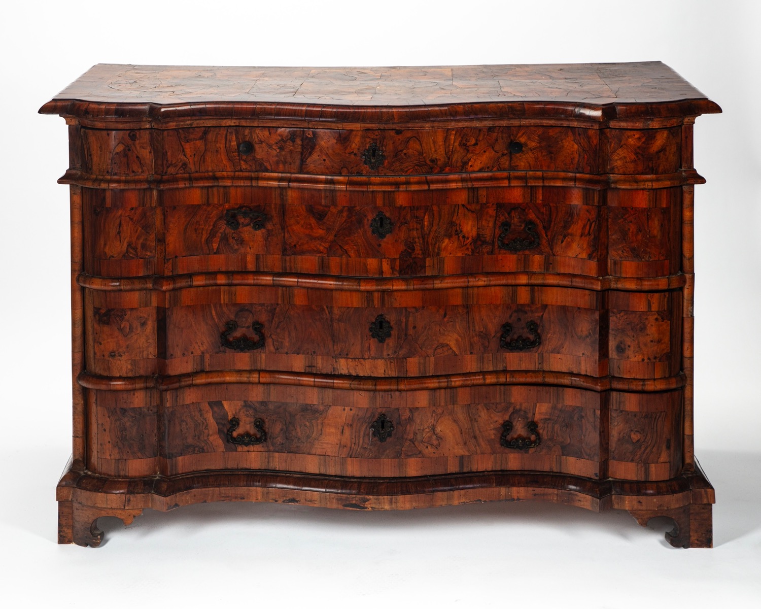 il fronte fortemente mosso a quattro cassetti, piano sagomato, piedi a mensola (difetti)il fronte fortemente mosso a quattro cassetti, piano sagomato, piedi a mensola (difetti)