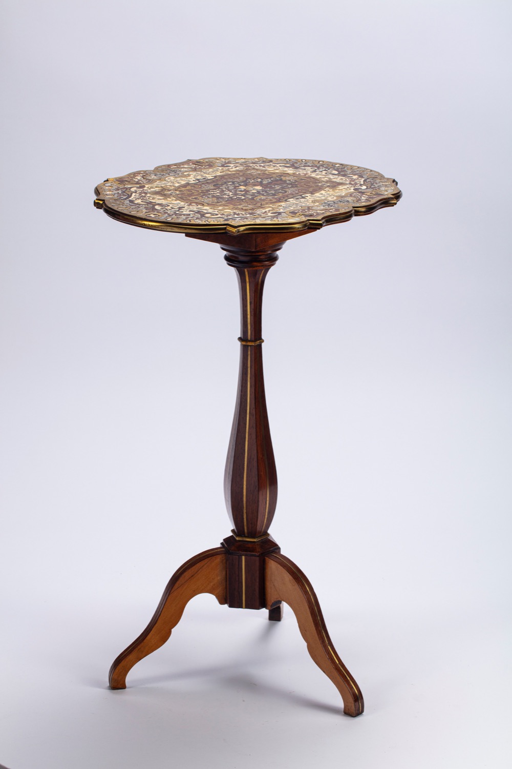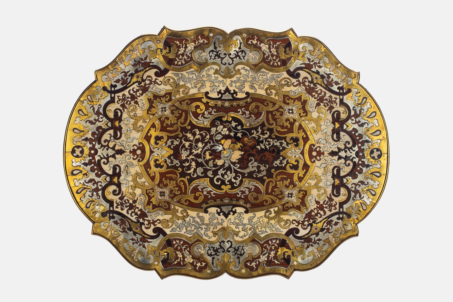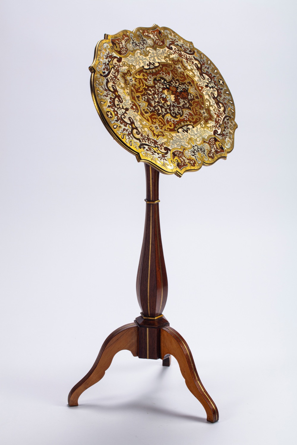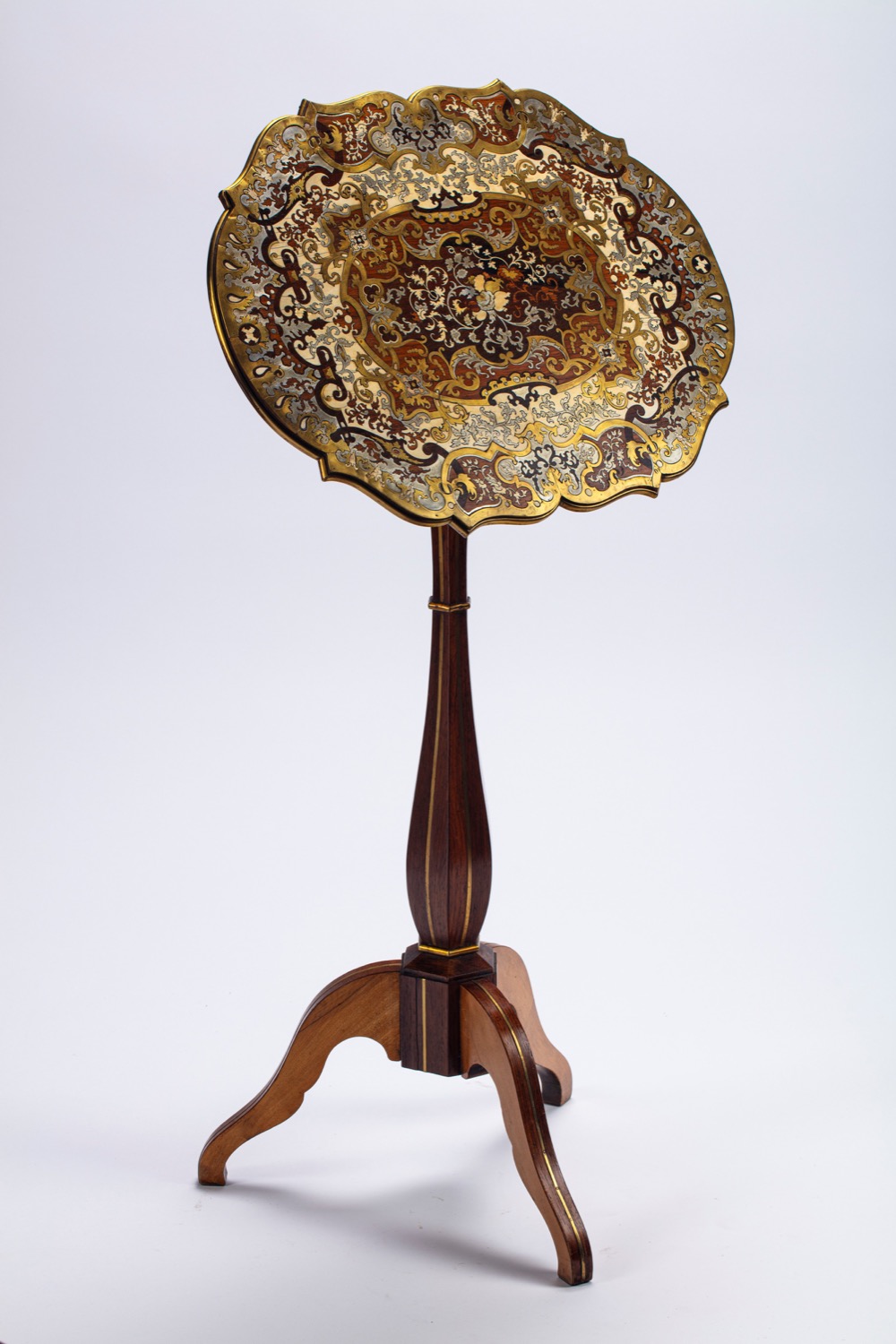Tavolino con piano a vela in acero riccamente intarsiato in ottone, avorio, palissandro ed ebano. Secolo XIX