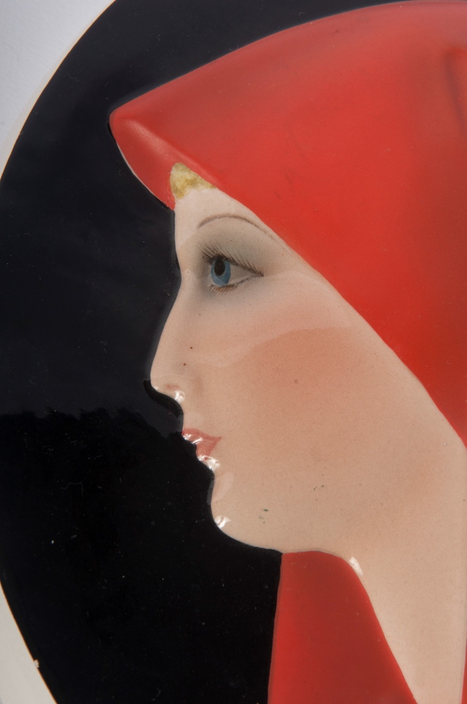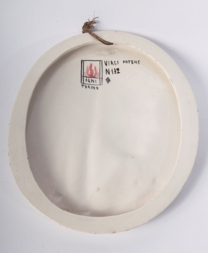 "Virgo Potens" , medaglione a rilievofoggiatura a stampo, in ceramica policroma.