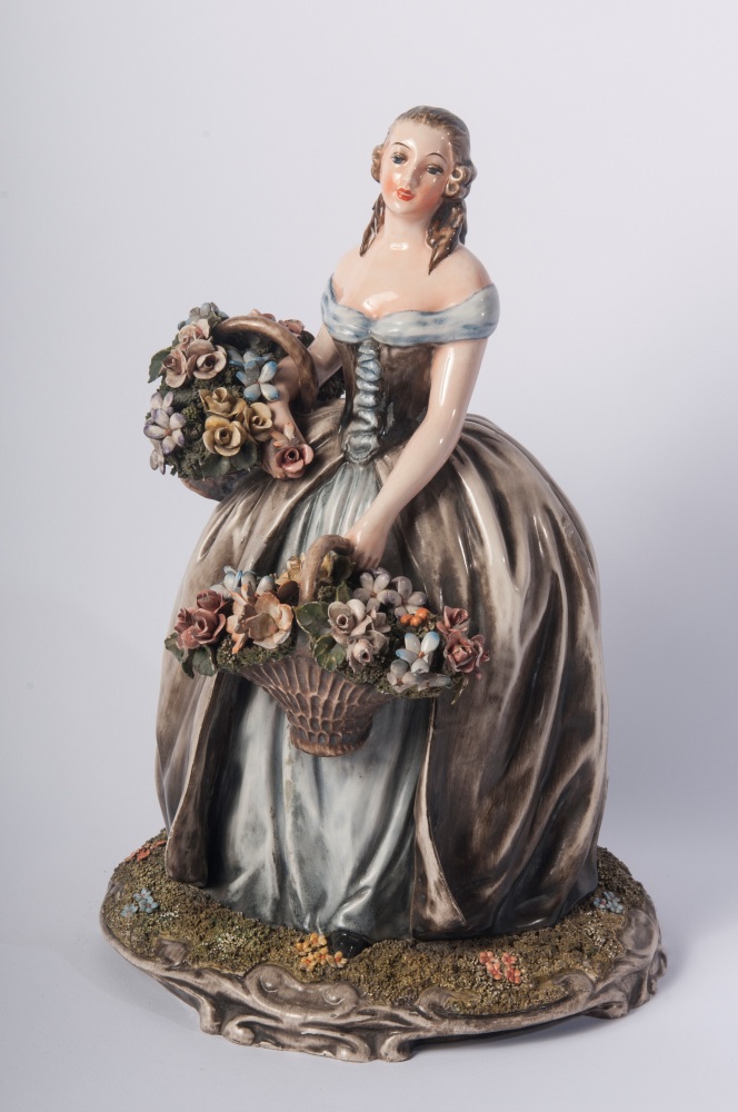 Fanciulla con cestino e fioriscultura modellata a colaggio in ceramica policroma a tutto tondo.