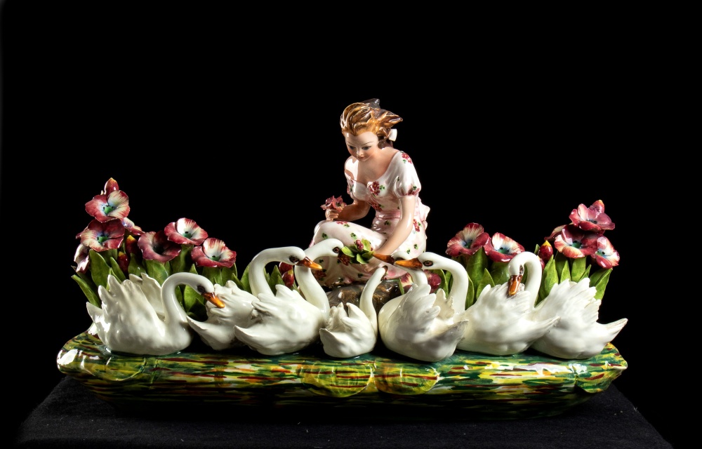 CARLO MOLLICA (Napoli, XX secolo - ) Fanciulla con cigni Metà XX secolo Ceramica policroma 30 x 54 x 20 cm ca