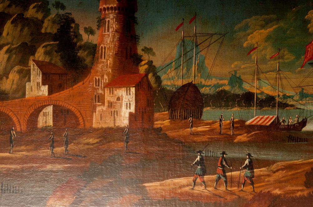Veduta di marina con imbarcazioni e costruzioniin cornice a lacca verde e crema.