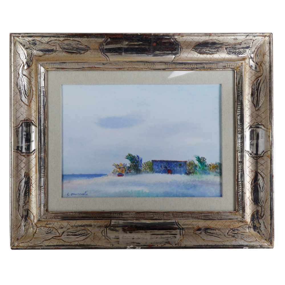 GIOVANNI OMICCIOLI (Roma, 1901 - 1975) Capanno blu a Fregene dipinto a olio su tela 36 x 52 cm