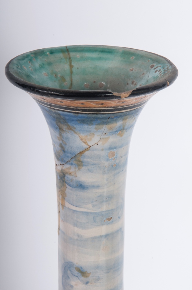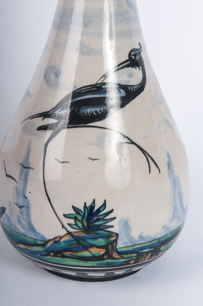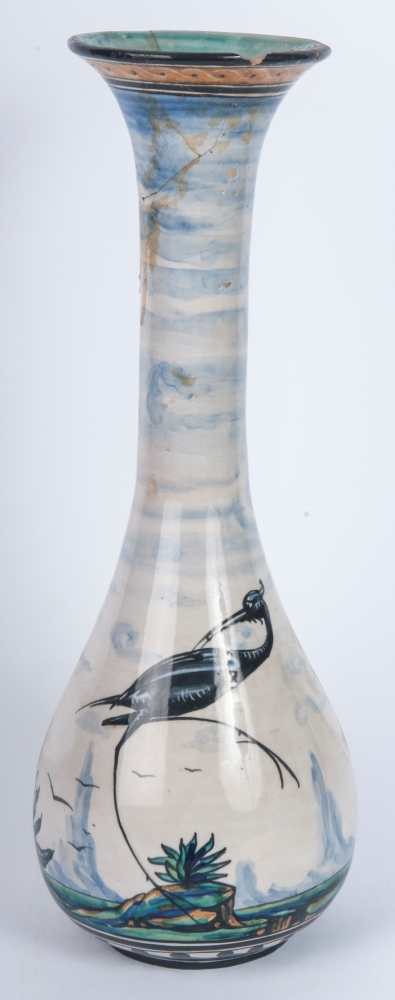 Vaso piriformein ceramica policroma. Corpo globulare con lungo collo dall'orlo svasato e appoggio ad anello. Decoro con uccelli su sfondo palustre e cielo azzurrato con uccelli su fondo bianco.