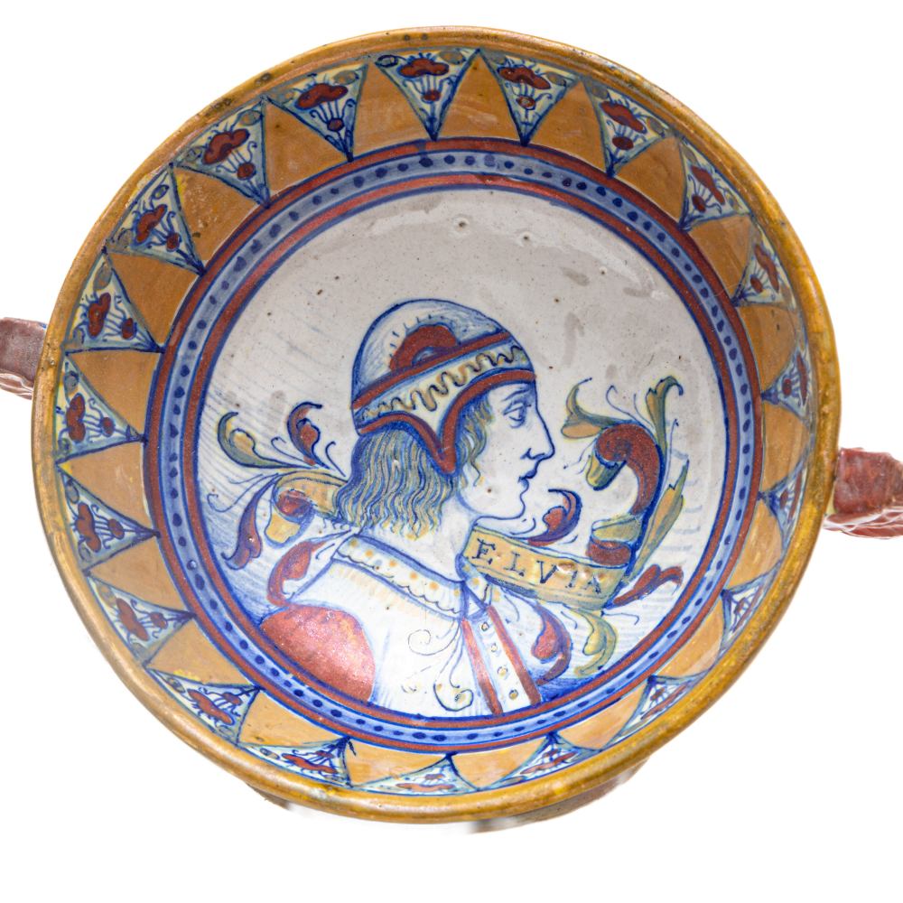 Alzata centrotavola in ceramica a lustroa forma di coppa biansata con profilo di personaggio nell'incavo.