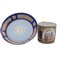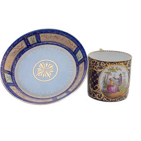 Tazza a litron in porcellana policroma,a fondo blu con personaggi di genere entro riserva ovale e decori a graticcio e racemi in oro zecchino. Ansa squadrata. Piatto a vasca con decori a motivi geometrici in oro zecchino entro riserve su fondo blu. Al retro fondo ribassato.