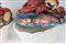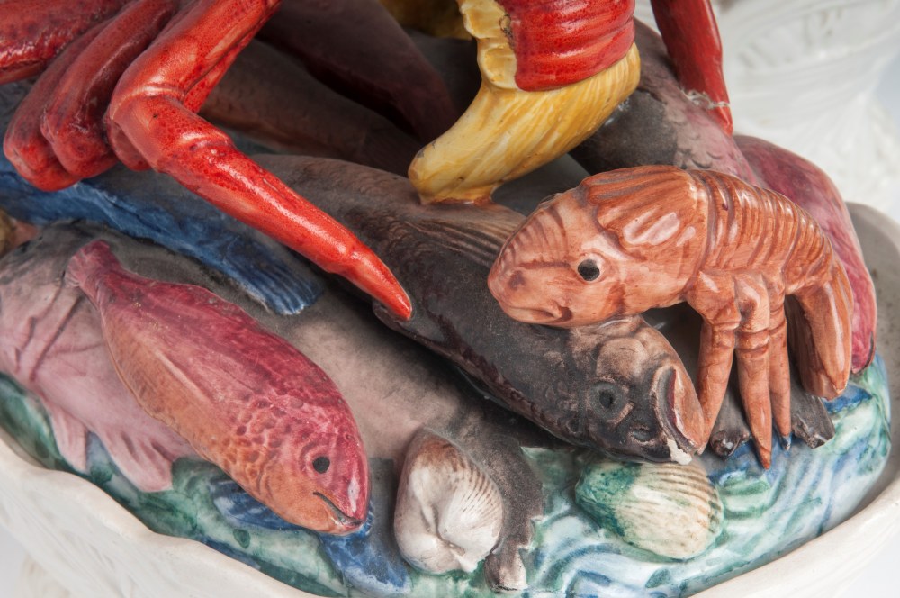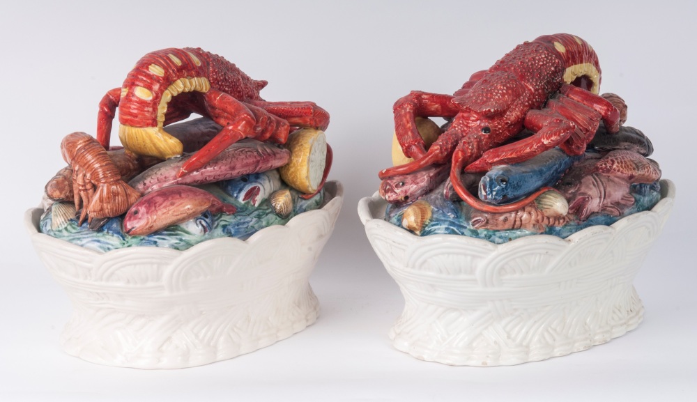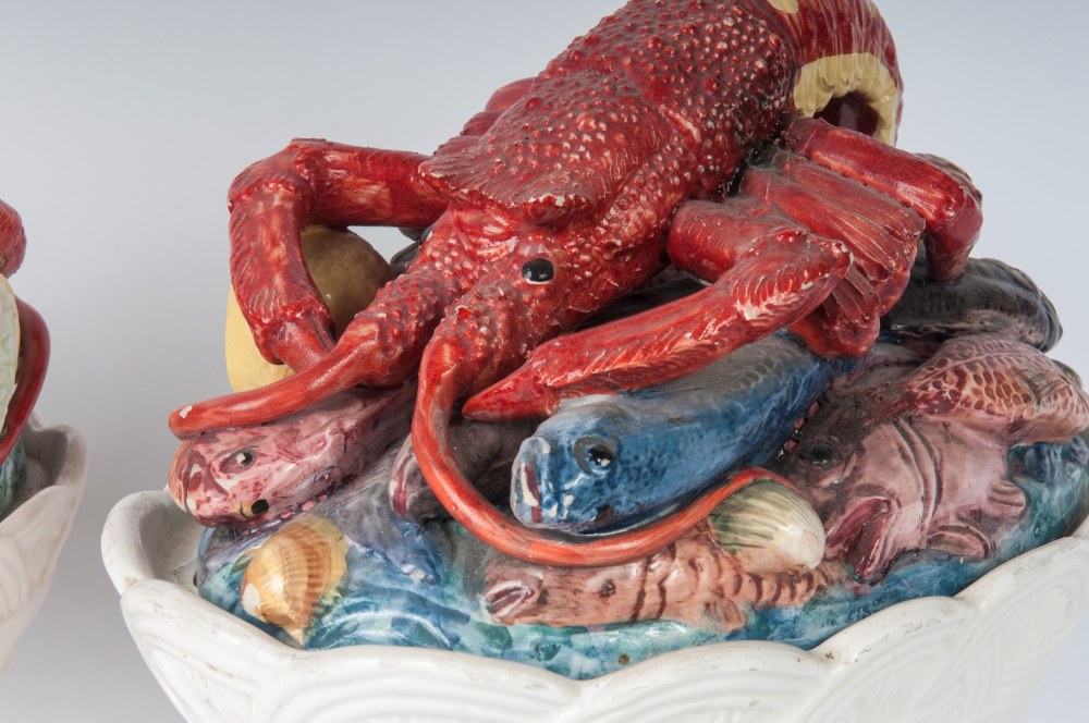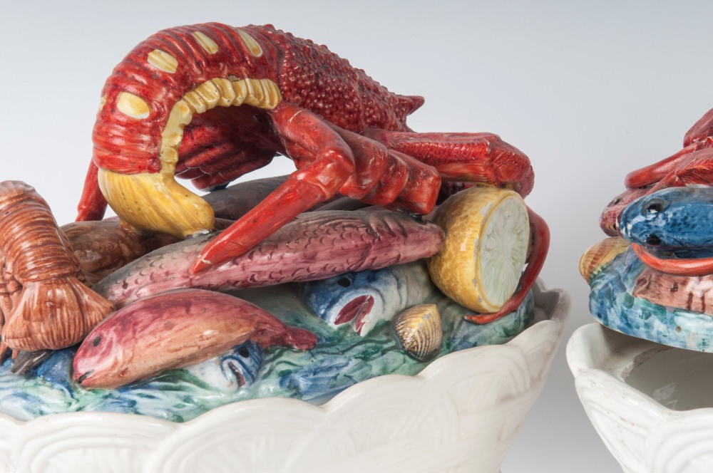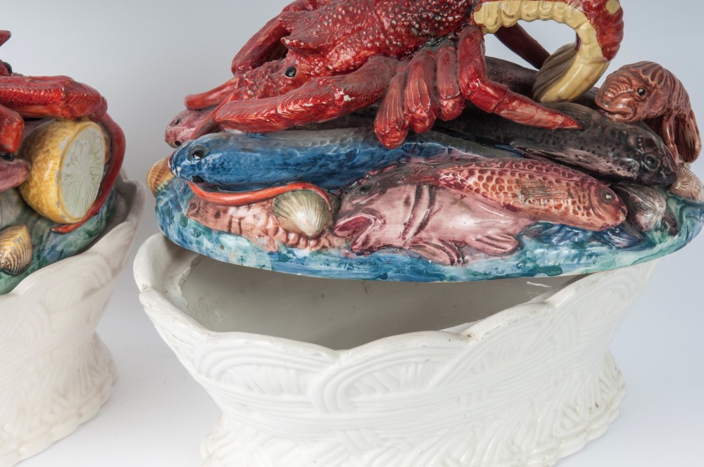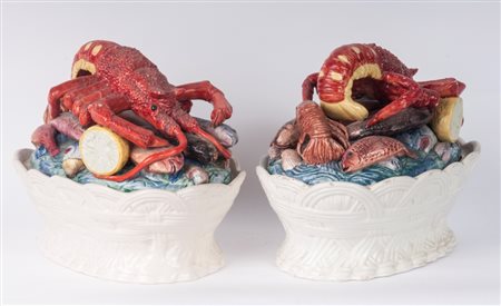 Coppia di legumiere in terraglia biancacon coperchio a pesci e crostacei in rilievo. Manifattura probabilmente italiana, prima metà XX secolo