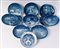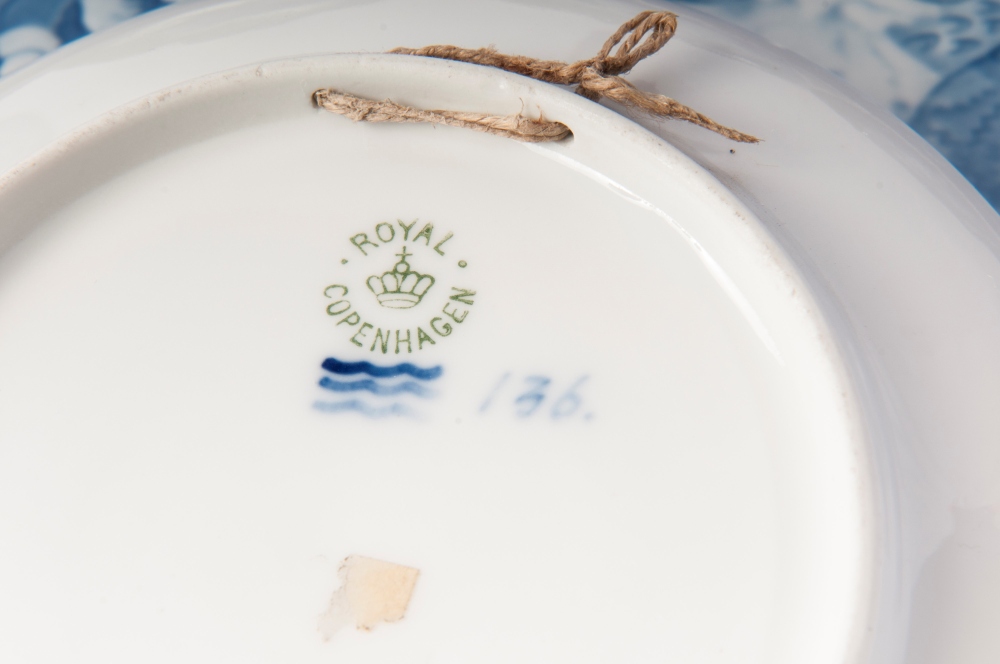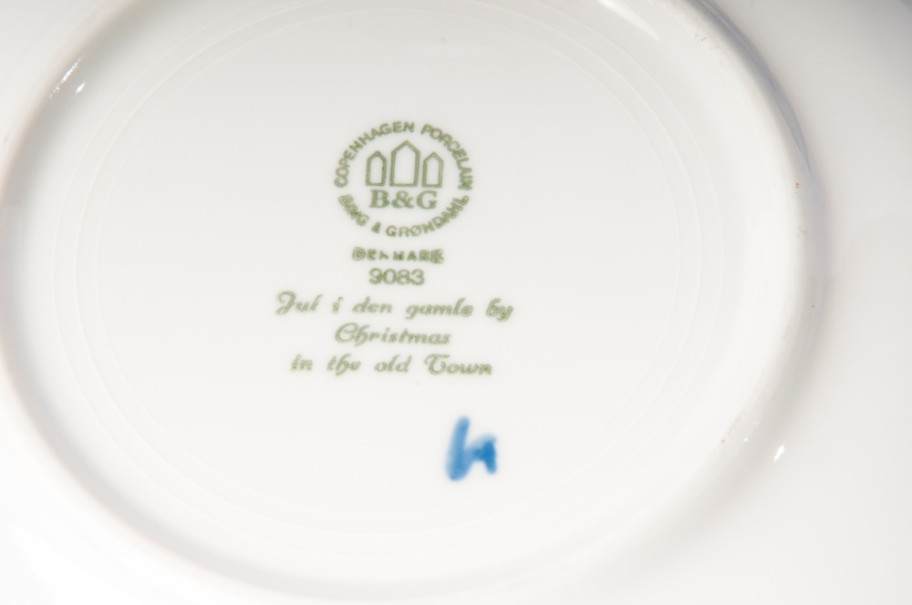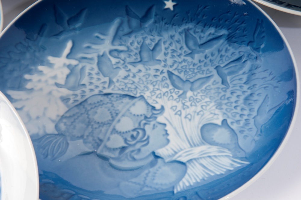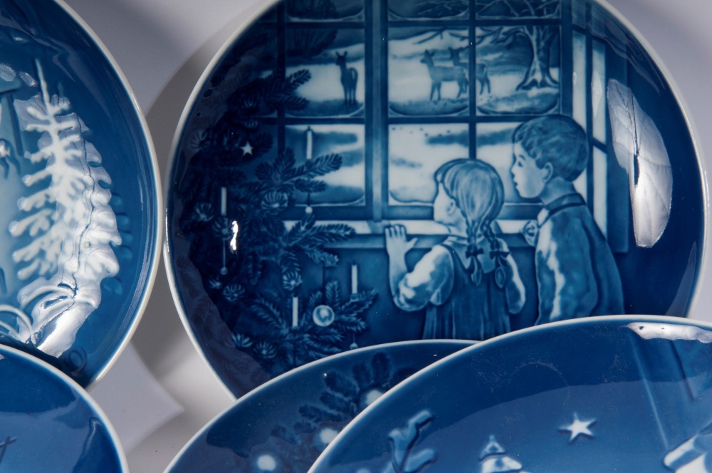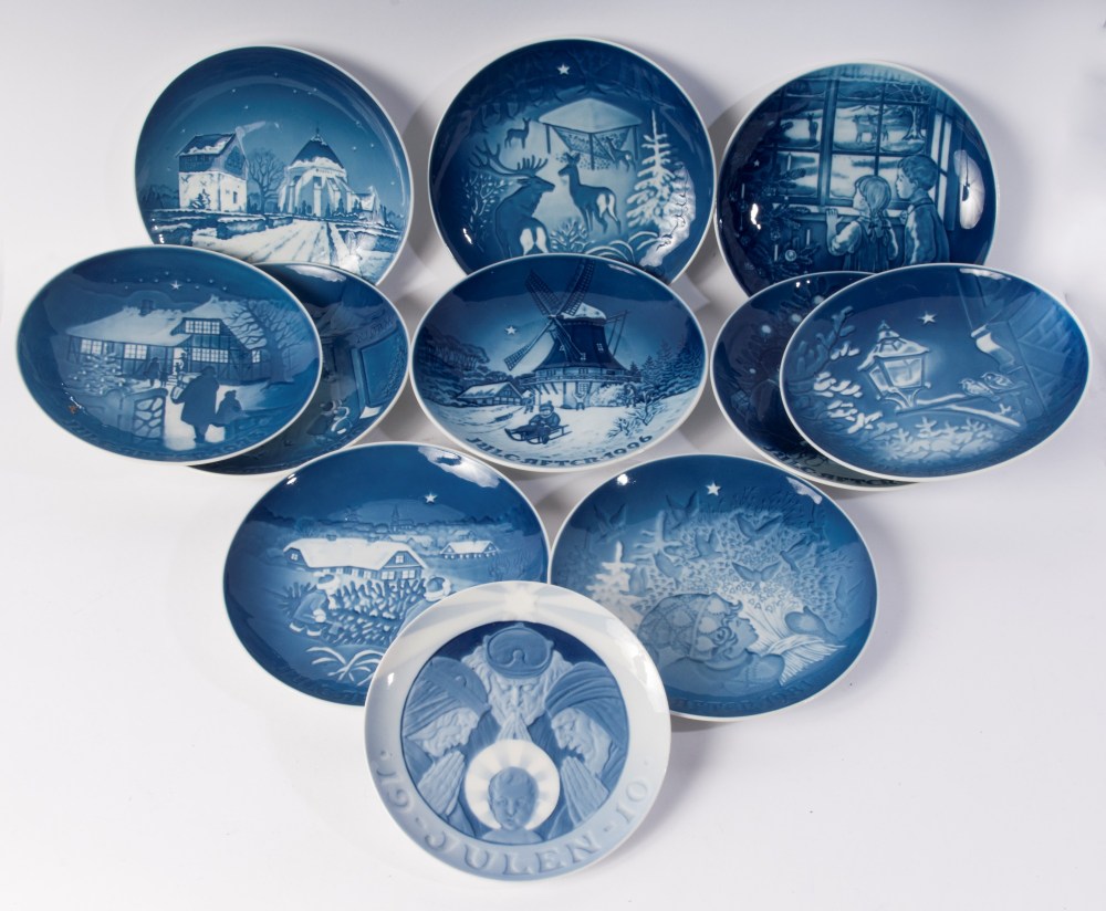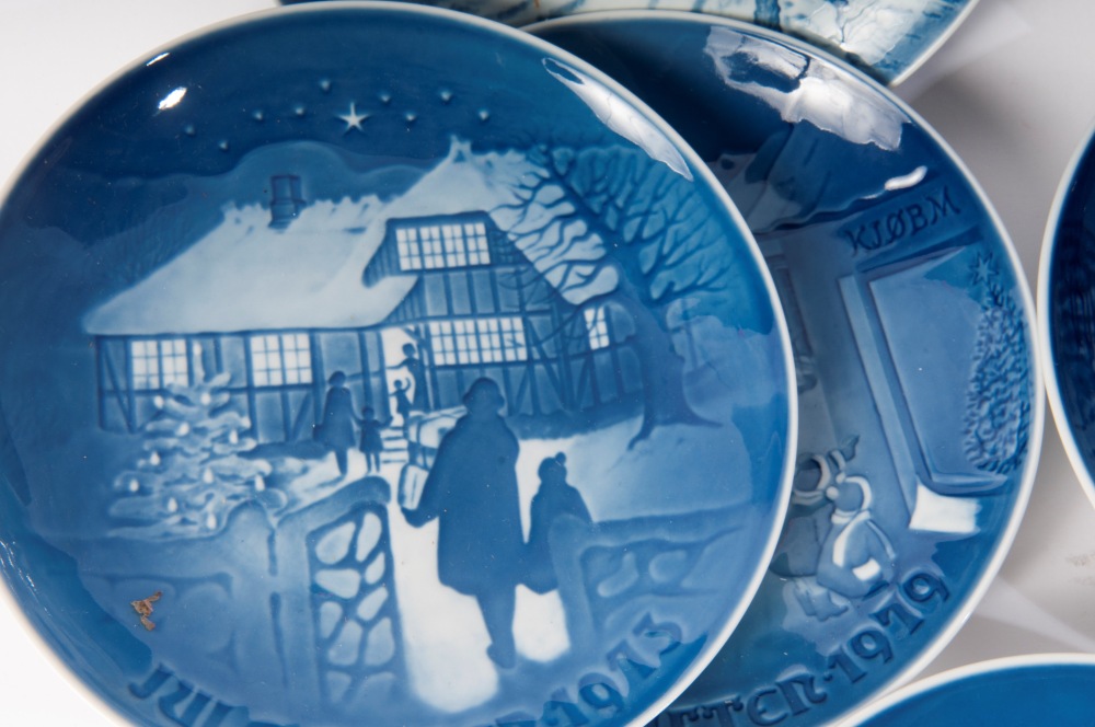 Lotto di sessantasette piatti con scene di Natale, da muro, in porcellana a fondo blu. Manifattura B e G. Danimarca. Dalla prima metà XX secolo a fine secolo