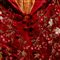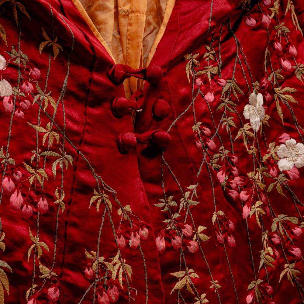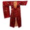 Chimono in seta rossa con fasciaa decoro floreale ricamato a rilievo. Artigianato dell'estremo oriente.