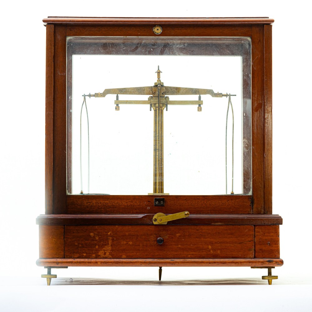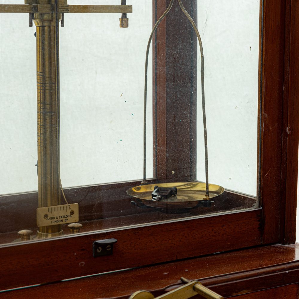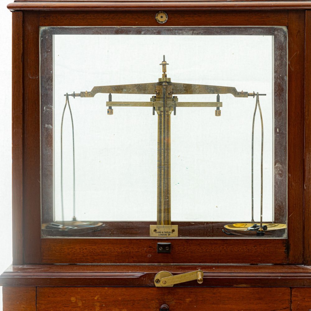 Bilancia da farmaciaentro bacheca in legno di ciliegio. Manifattura Baird & Tatlock Londra .