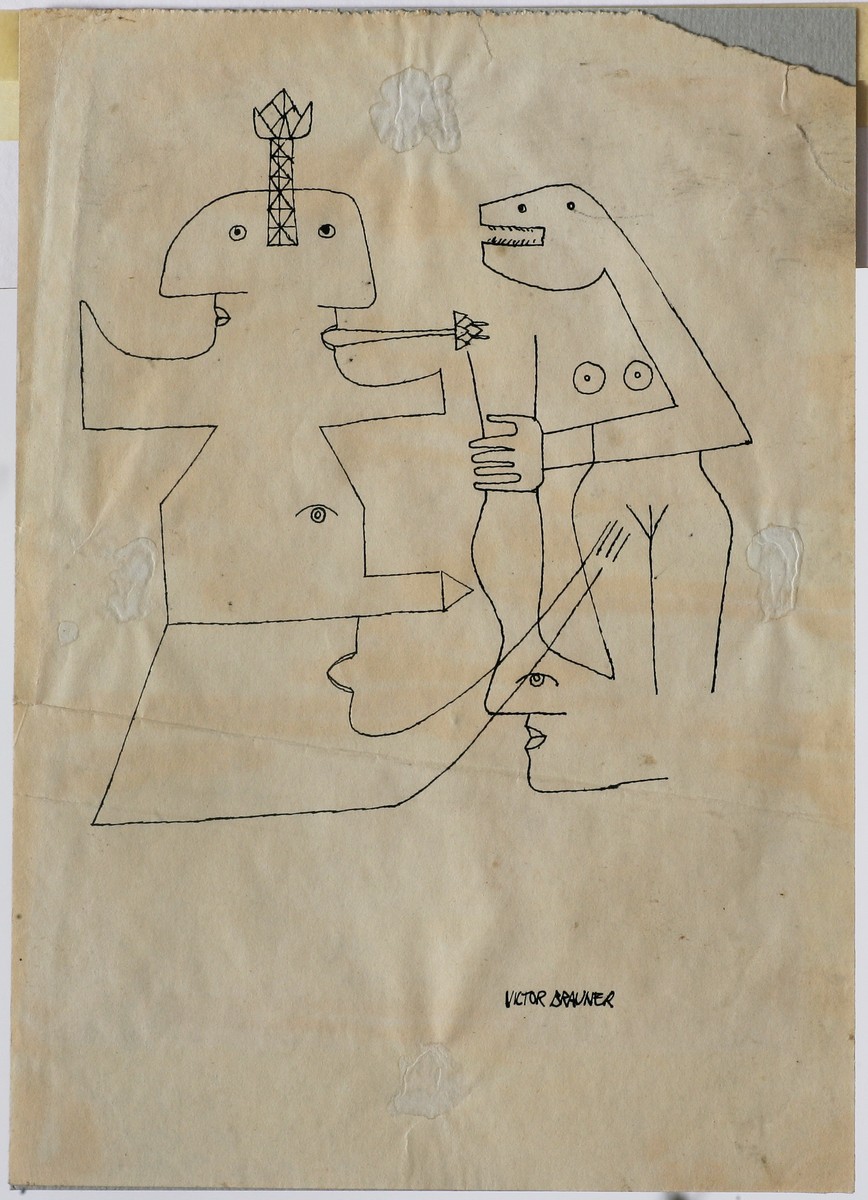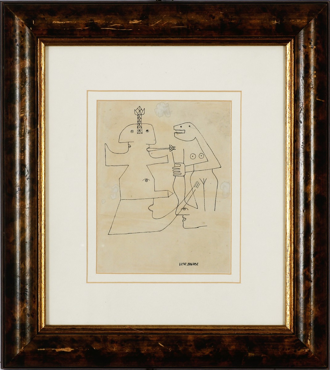 Firmato in basso a destra. La carta è incollata al cartone di supporto in quattro punti dove la colla è permeata in superficie. L'angolo in alto a destra è strappato. Il foglio presenta una piegatura orrizzontale nella zona centrale. Cornice presente.