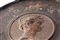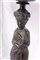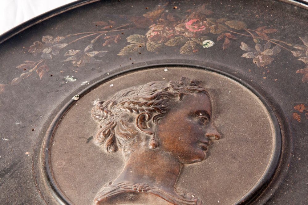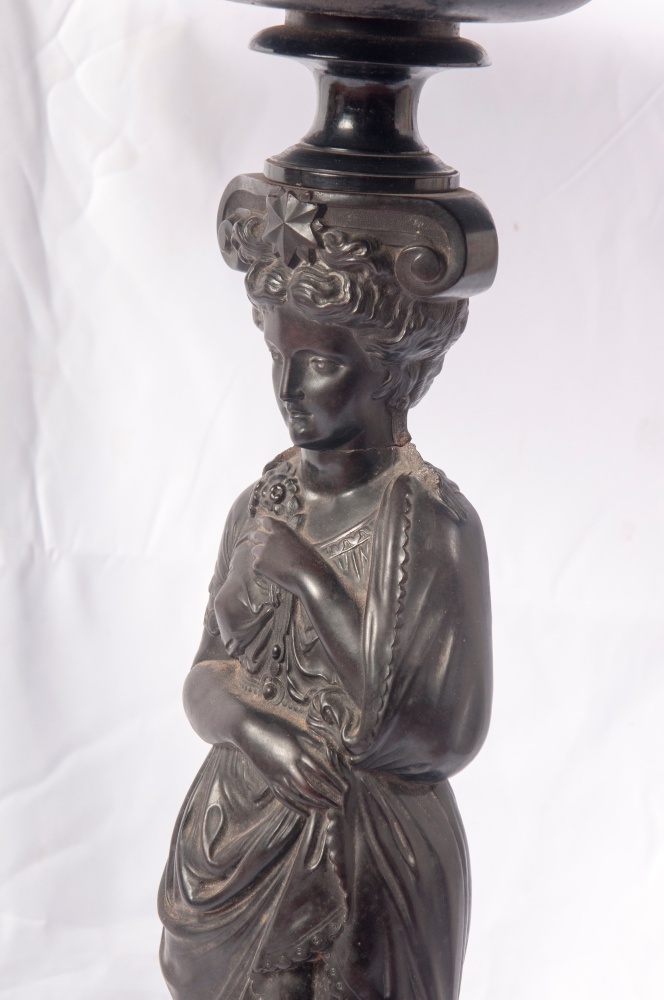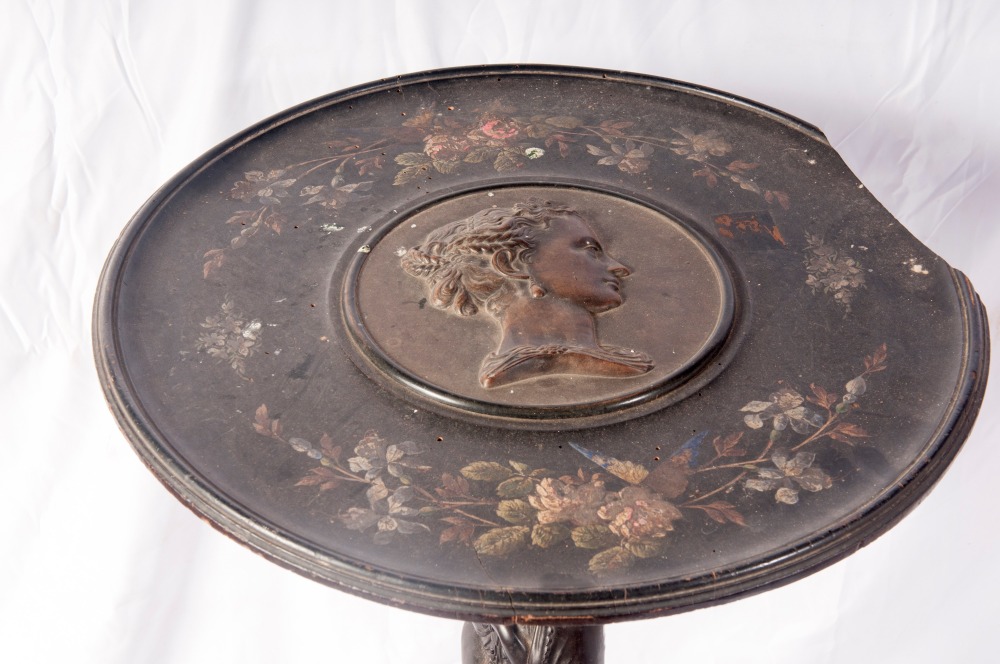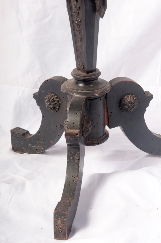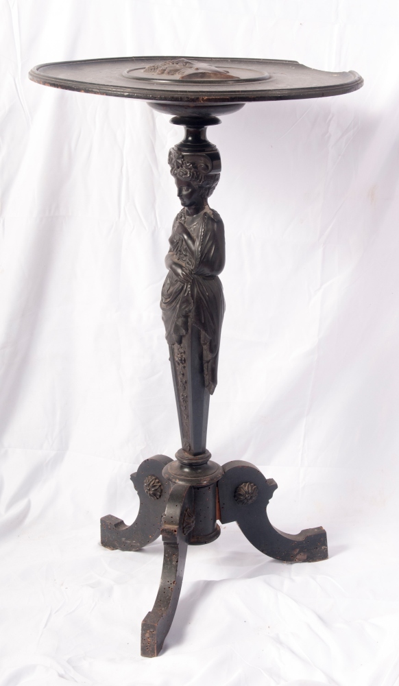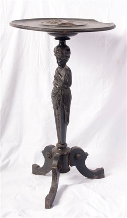 Gueridon in legno ebanizzato con piano da appoggio circolare con profilo femminile in rilievo al centro, gambo a cariatide e appoggio a tre piedi.