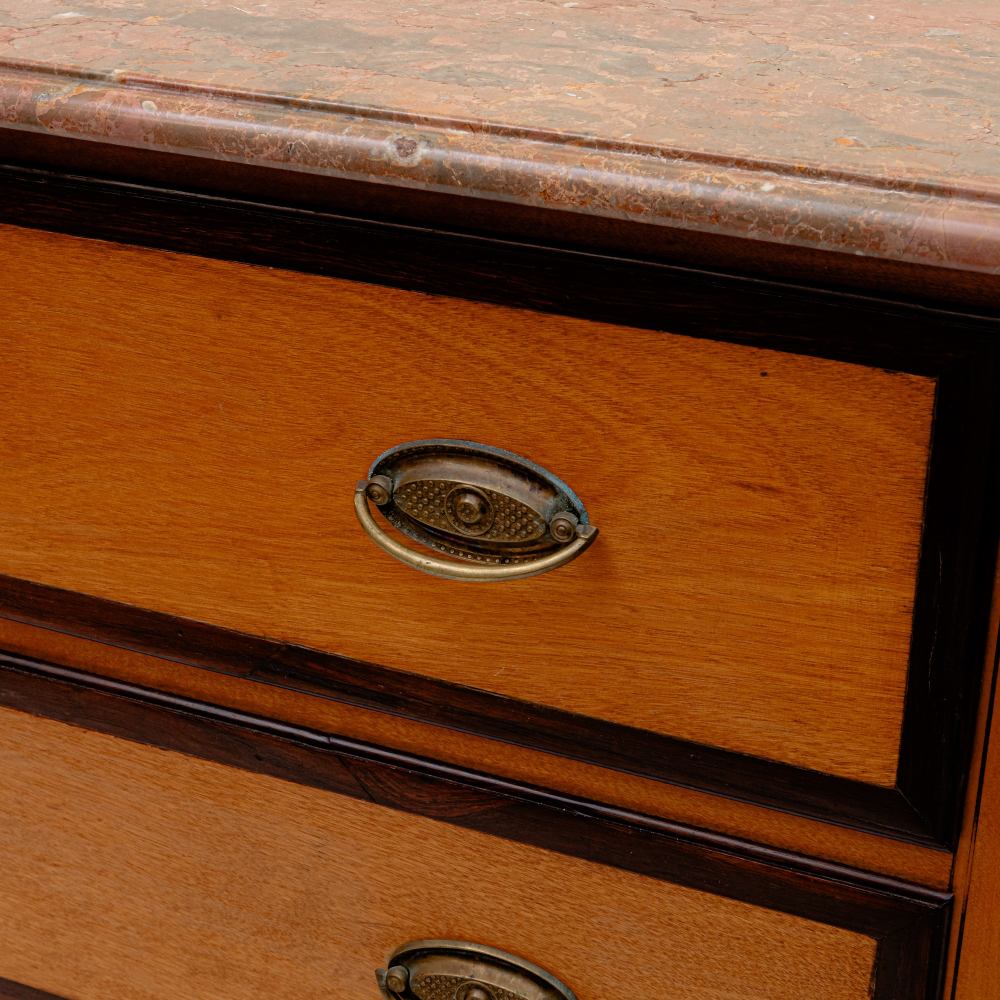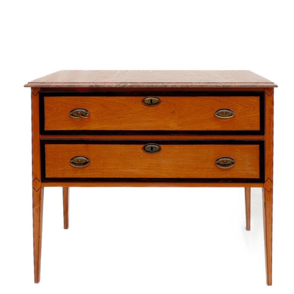 Comò a due cassetti,di forma rettangolare in legno, a quattro gambe a tronco di cono con filettature in legno di frutto sul fonte, sui fianchi e sulle gambe, piano in marmo non pertinente. Ferramenta in ottone.