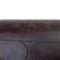 Baule in cuoio e legno,con finiture a borchie di ottone, interno foderato con stoffa dipinta a motivi floreali e pappagalli.