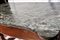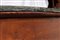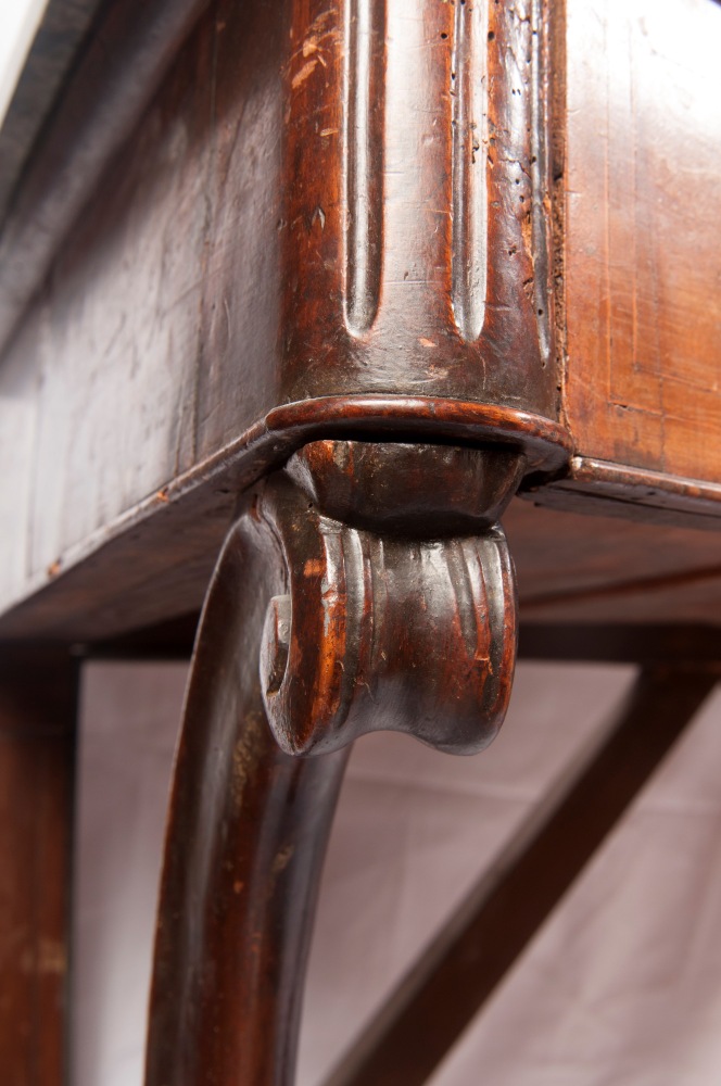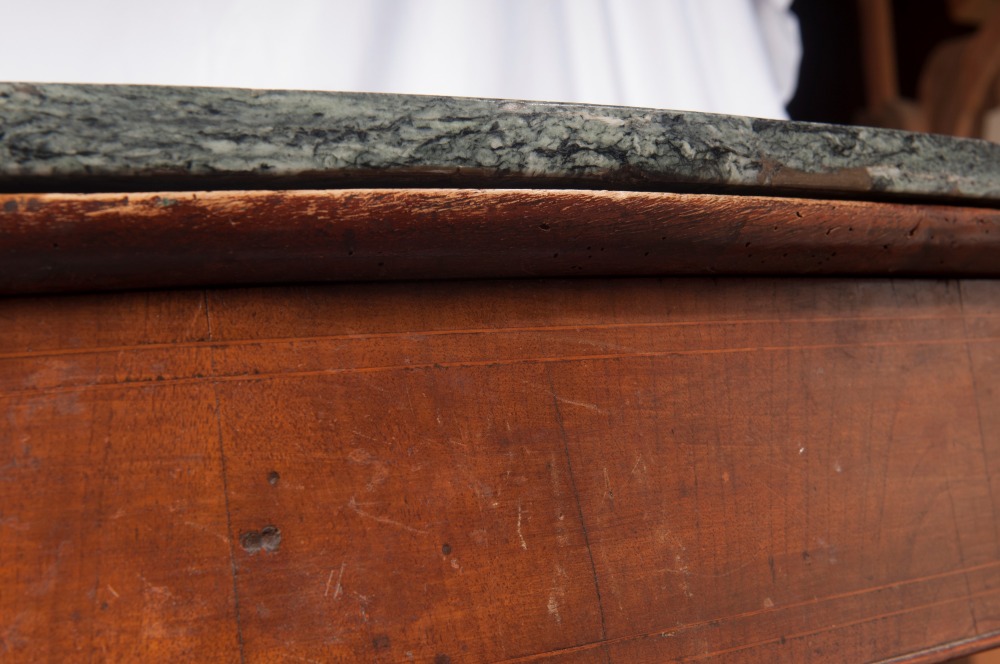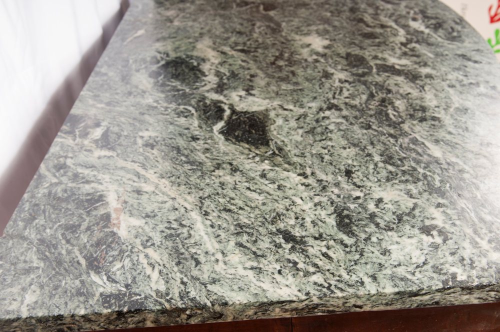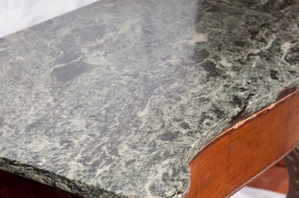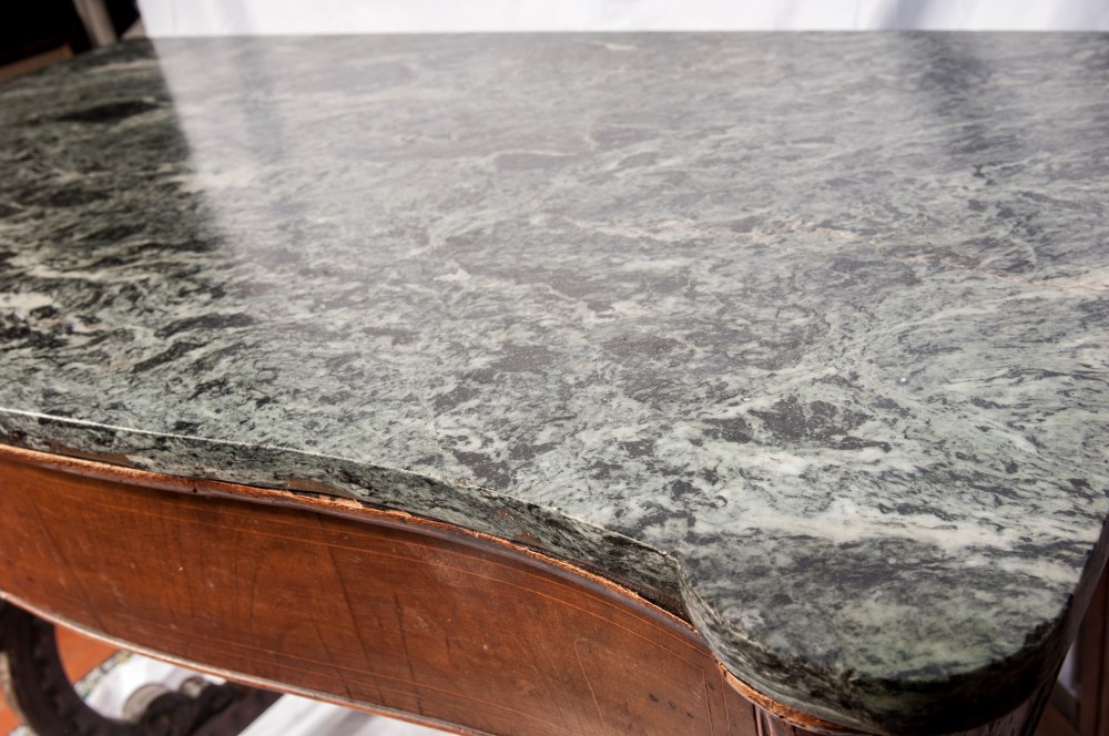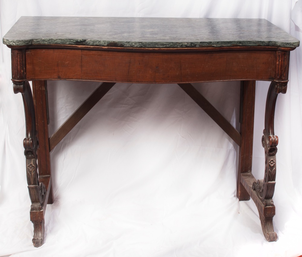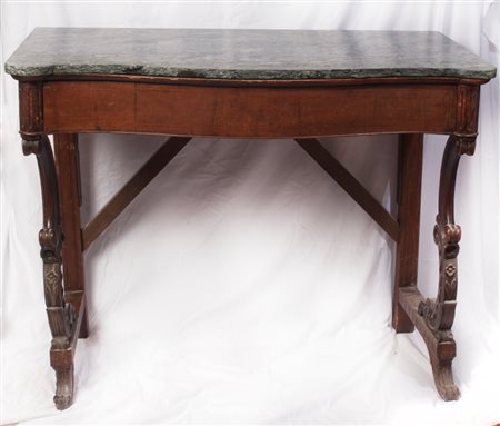 Tavolo consolle da paretein legno di noce con piano in marmo verde. Coppia di montanti a doppia esse con fascia frontale bombata contenente un cassetto.