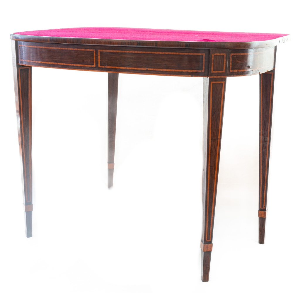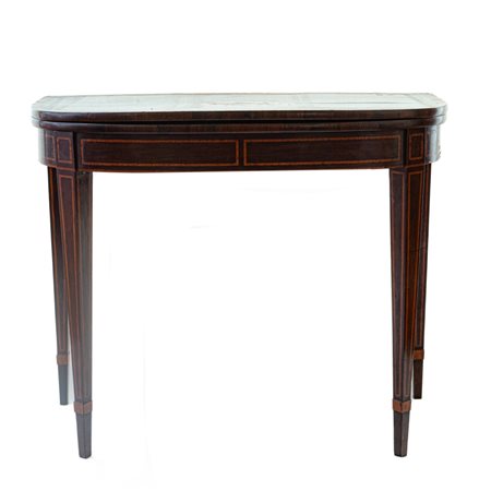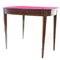 Tavolo a libretto in moganodi forma rettangolare ad angoli stondati, con quattro gambe troncoconiche rastremate verso il basso. Piano in panno rosso, elementi decorativi rettangolari con filettature in legno di frutto.