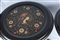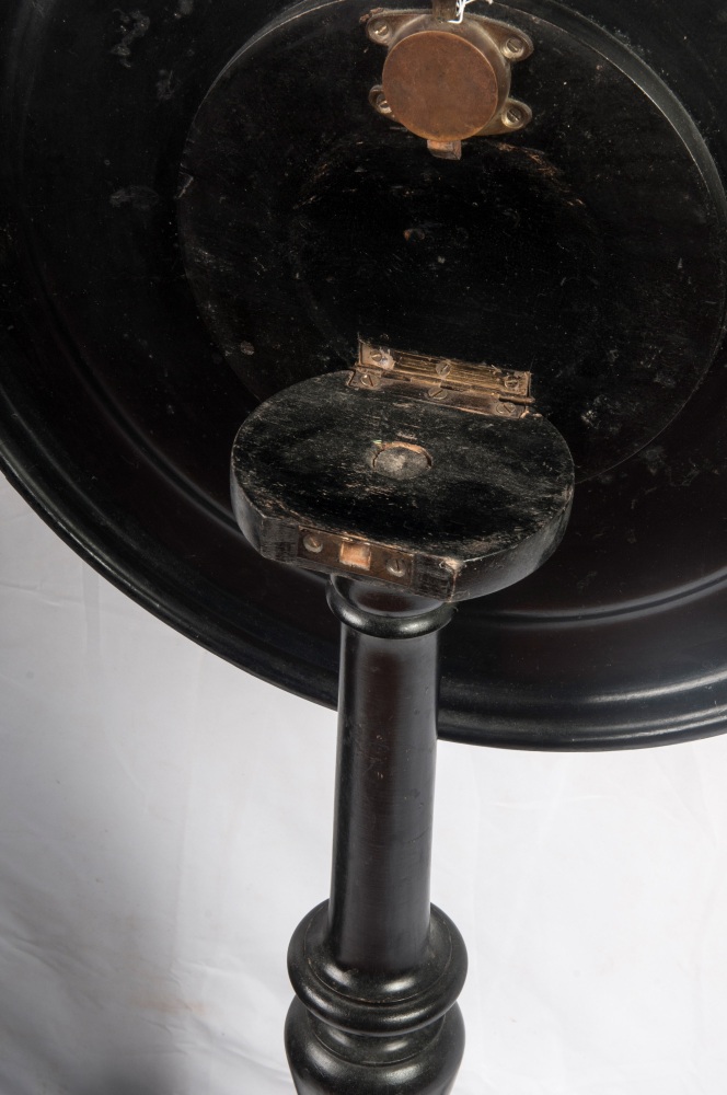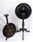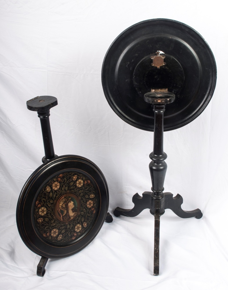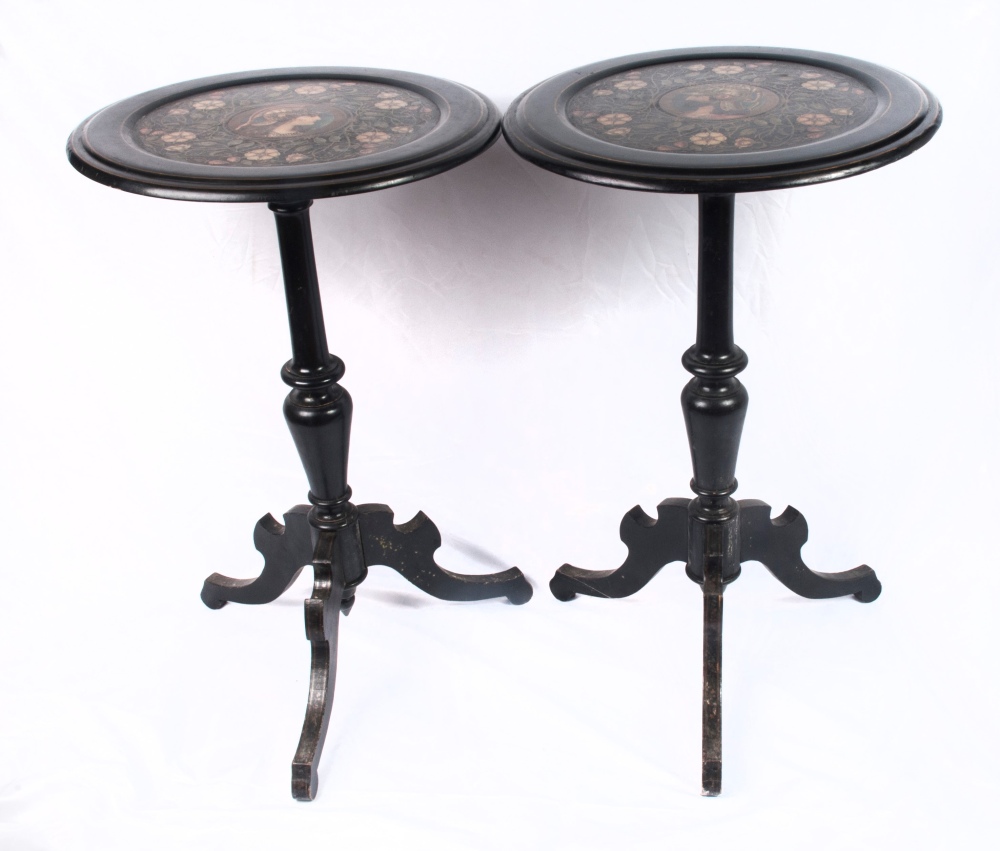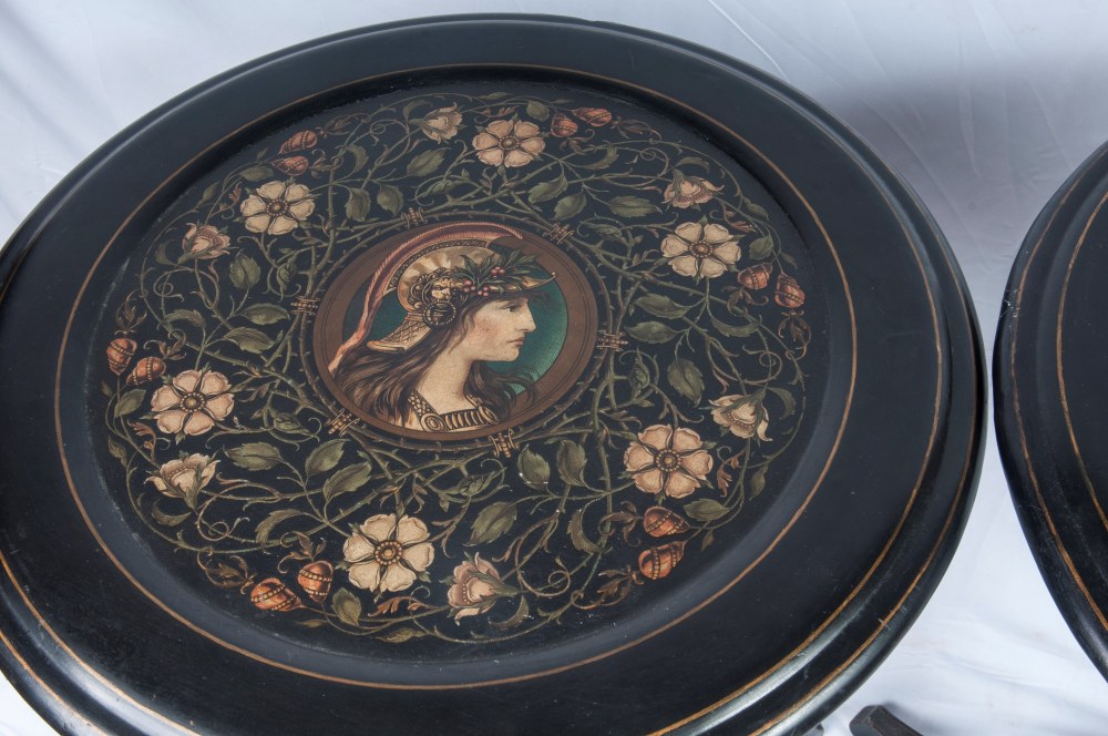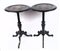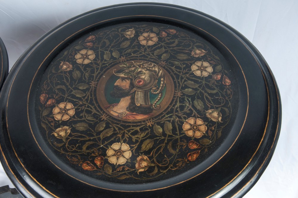 Coppia di gueridon a velapiano tondo con effigie di guerrieri maschile e femminile, fusto a fuso con anello centrale rastremato verso il basso, terminante con tre piedi da appoggio a virgola. In monocromo nero, presentano la superficie dei piani con decorazioni floreali policrome intorno alle due figure.