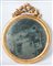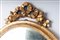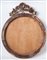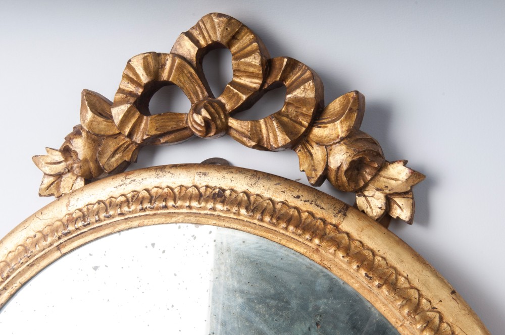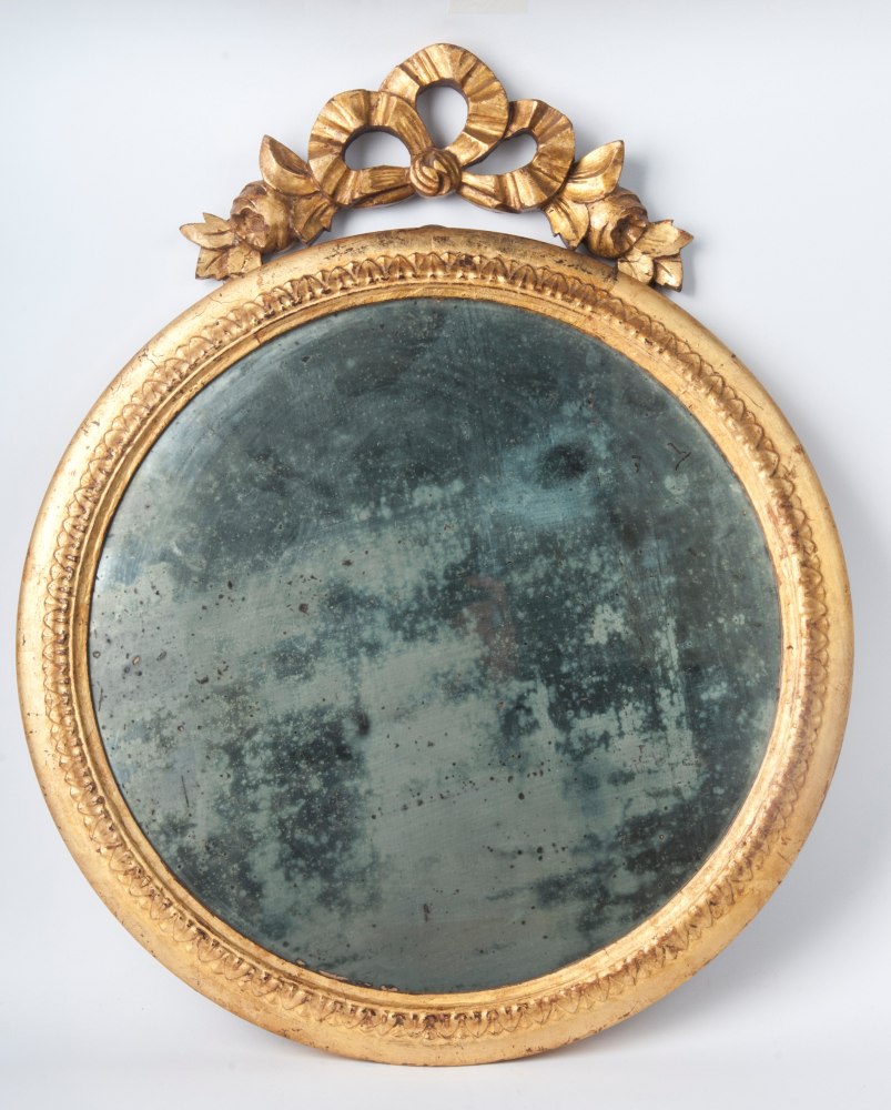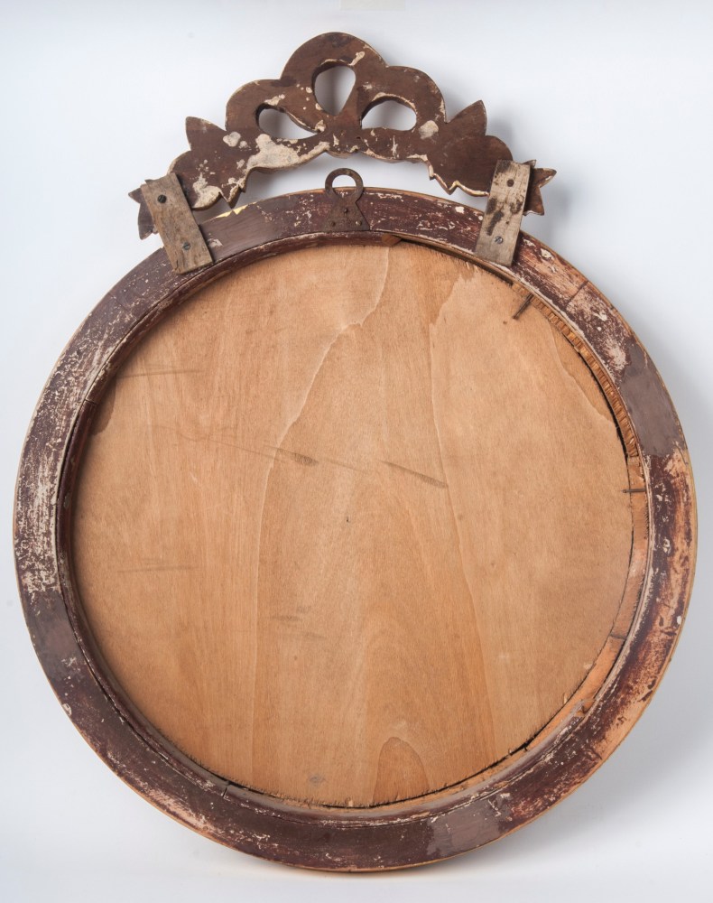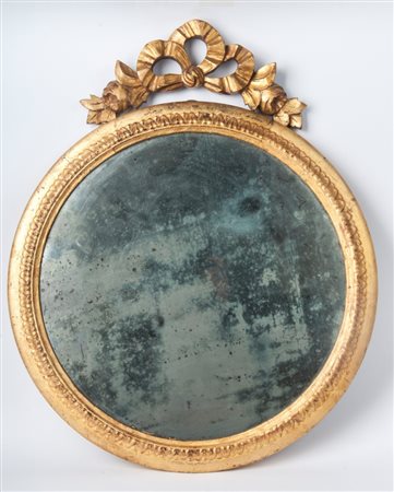 specchiera da parete ad assetto tondoin legno dorato scolpito a motivi di palmette lungo il margine superiore e cimasa a fiocco con fiori.