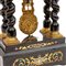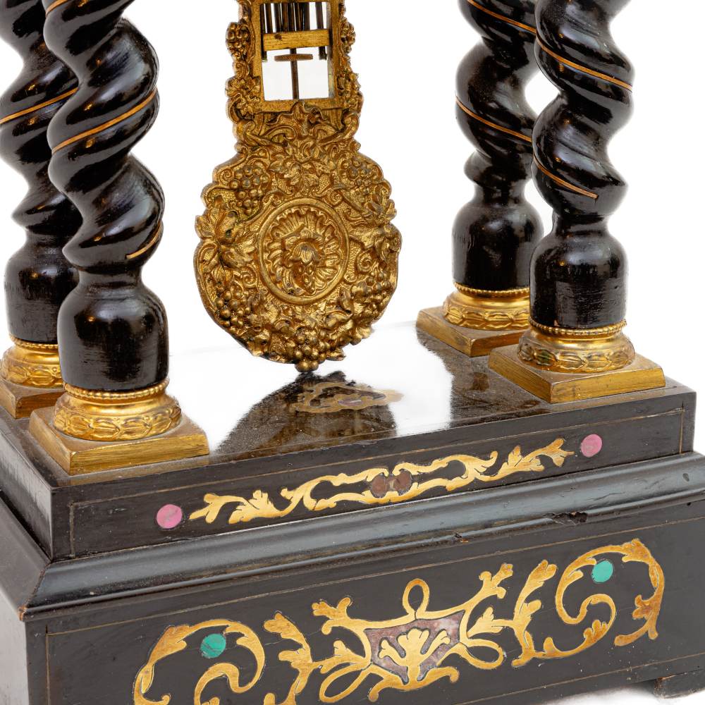 Orologio da appoggio, a forma di tempio, in legno ebanizzato, con quattro colonne tortili e finiture in ottone. Macchina con sospensore a lamina d'acciaio e regolatore a pendolo. Quadrante in smalto bianco a numeri romani di forma circolare a due fori per le ore e la suoneria.