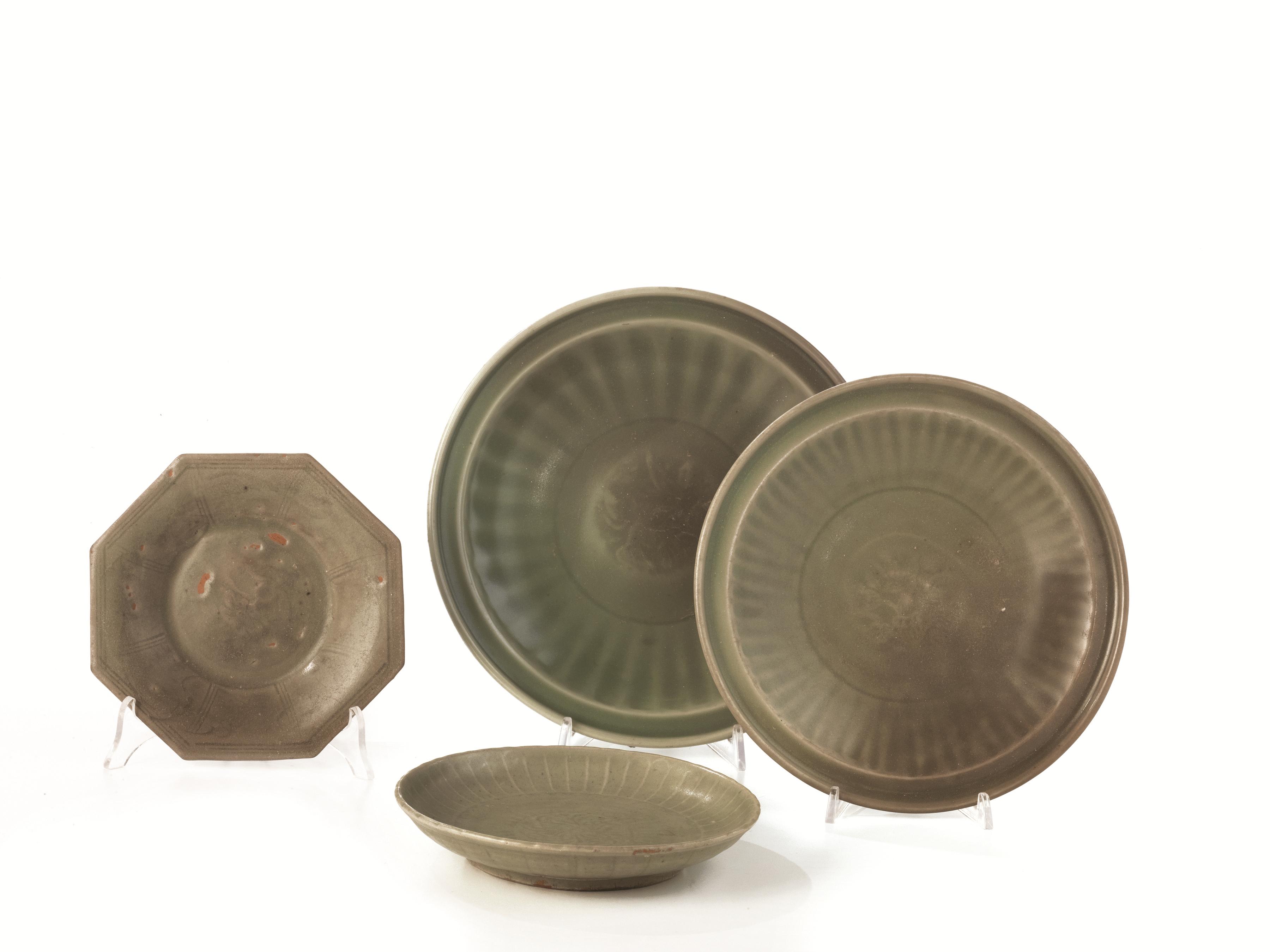 Lot 9 | TRE PIATTI, CINA, DINASTIA MINGin porcellana celadon, con decoro floreale,...