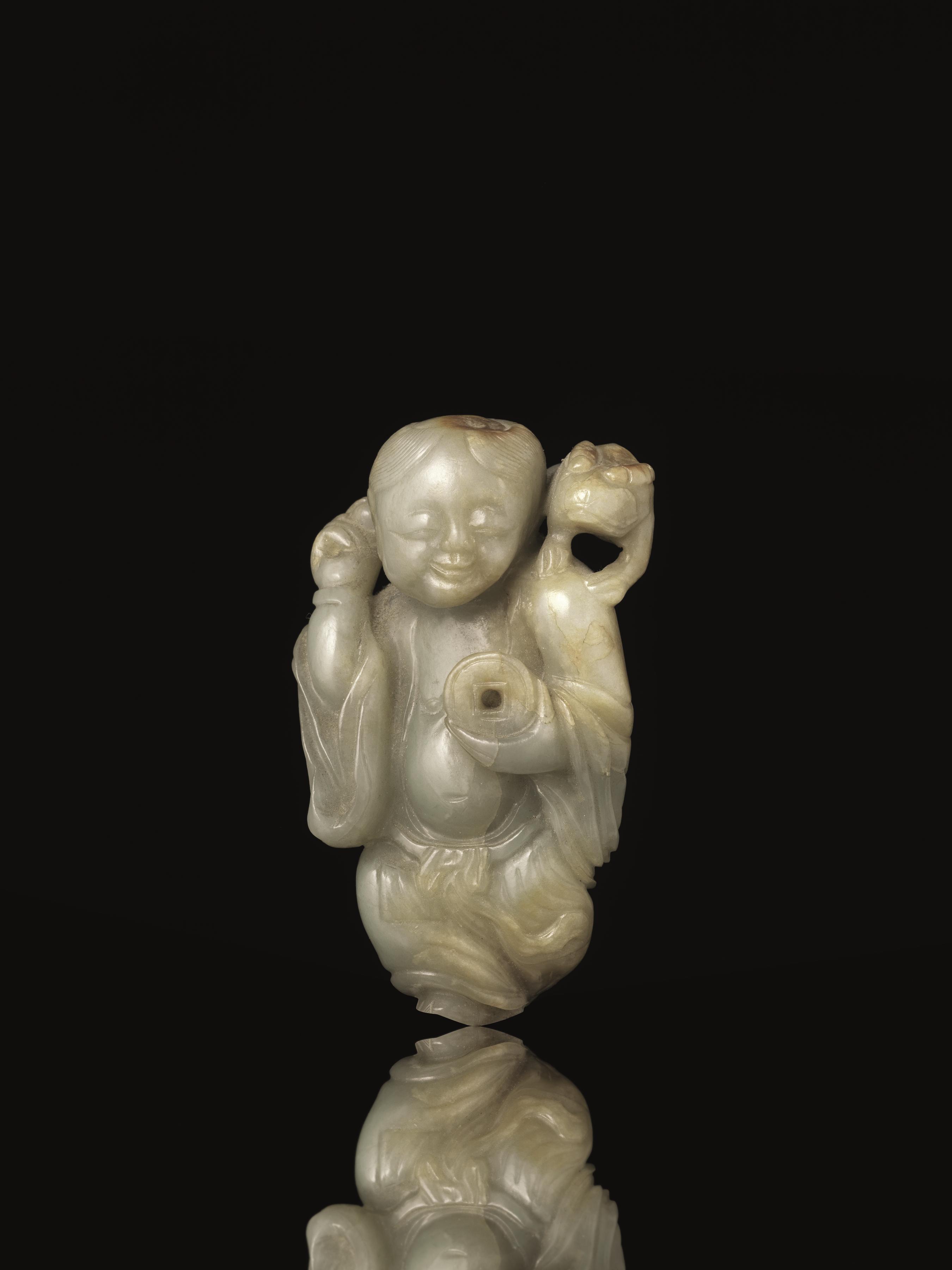 INTAGLIO, CINA, SEC. XIXin giada raffigurante bimbo con rana sulla spalla,...