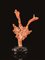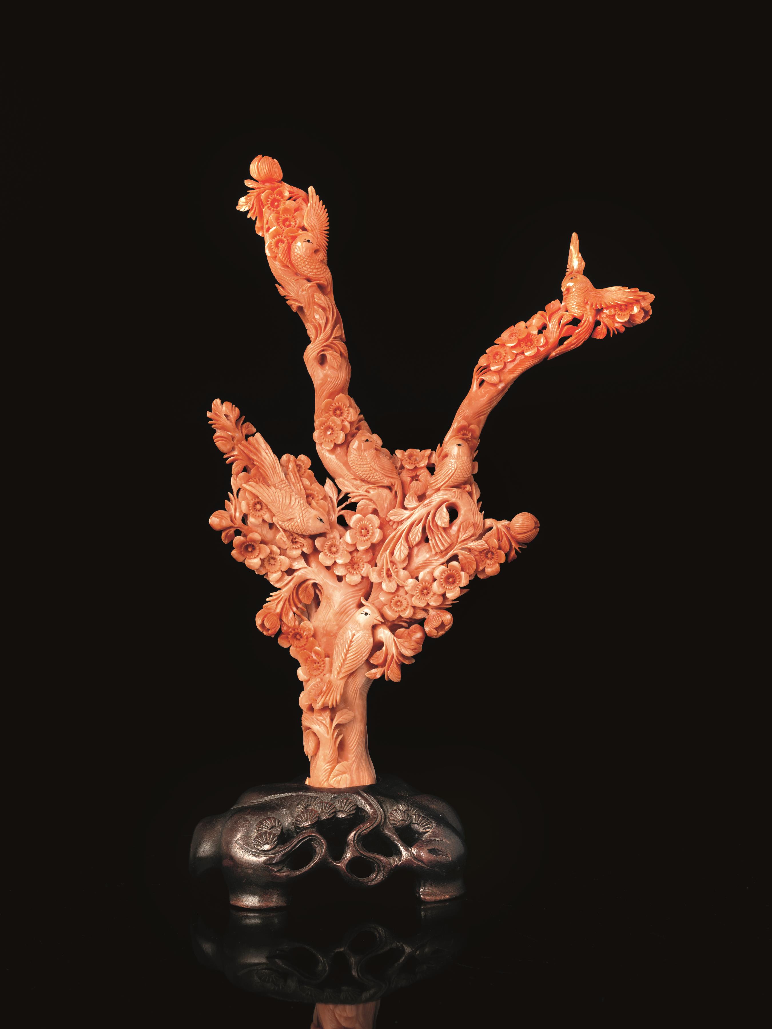 in corallo modellato nella forma di tronco d'albero in fiore sul quale si appoggiano dei volatili, alt. cm 27,5, su base in legno