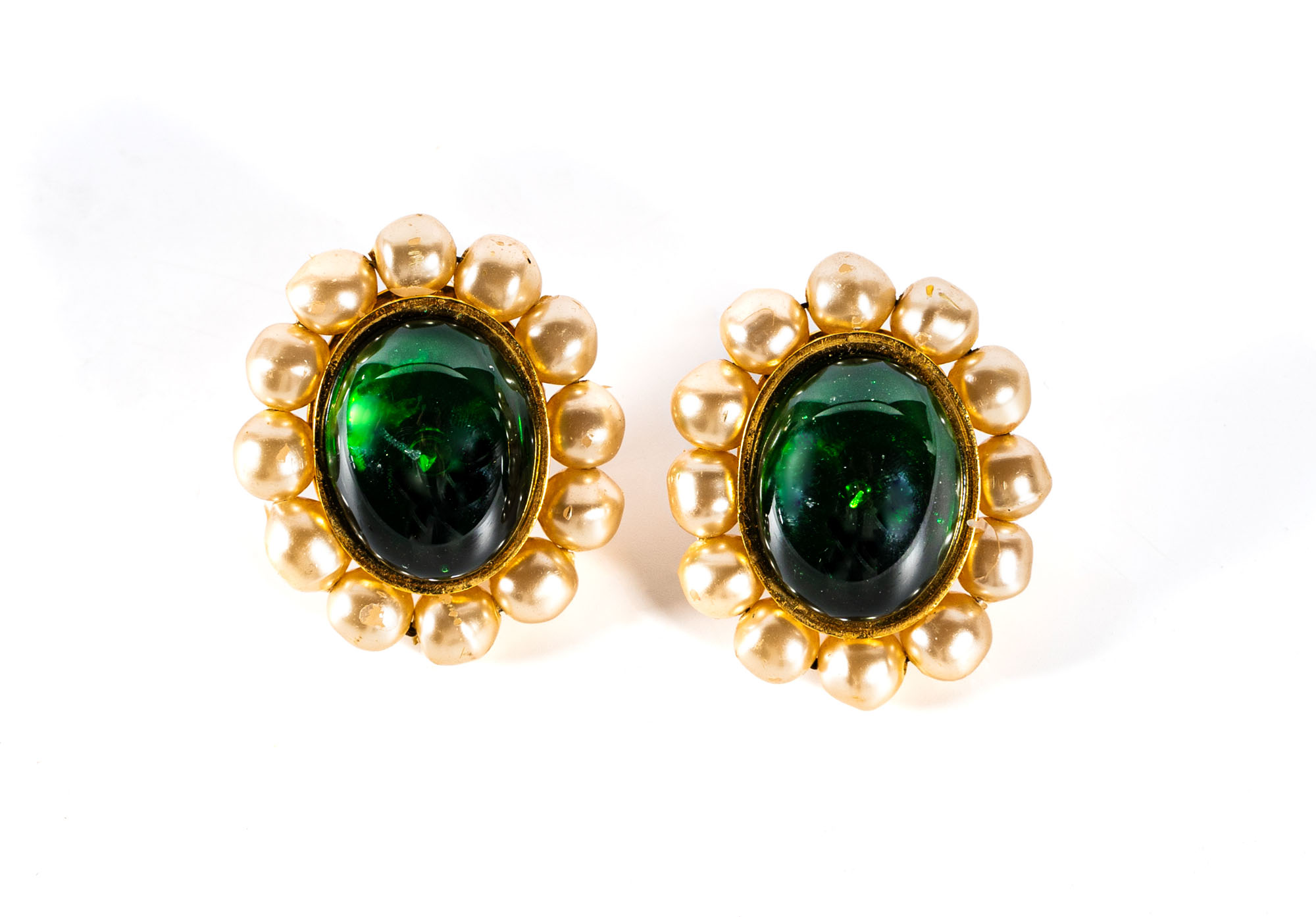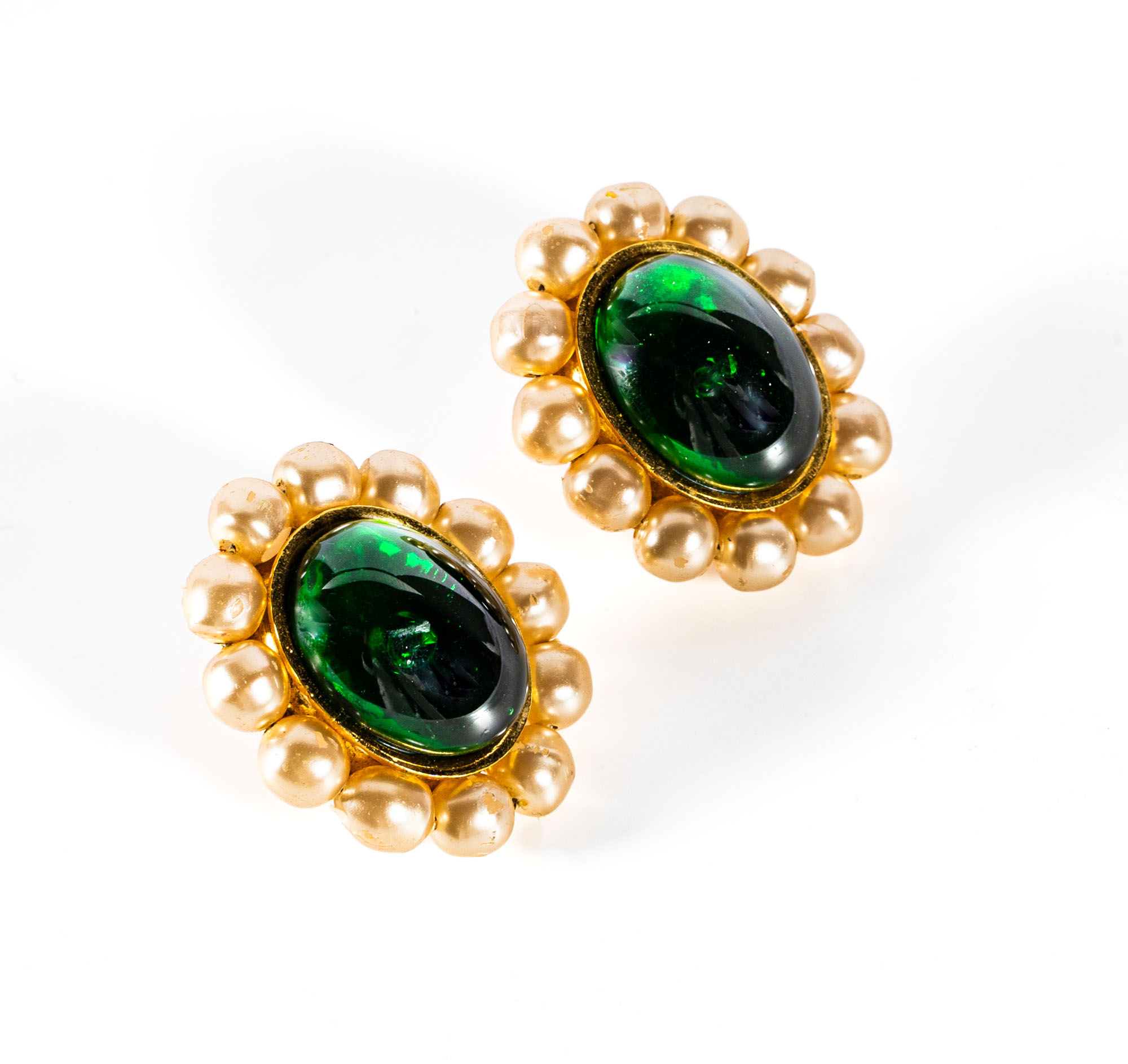 CHANELOrecchini a clipAnni '90, Collezione n.25In metallo dorato, pasta di vetro verde e finte perle4 x 3 cmIn buone condizioni