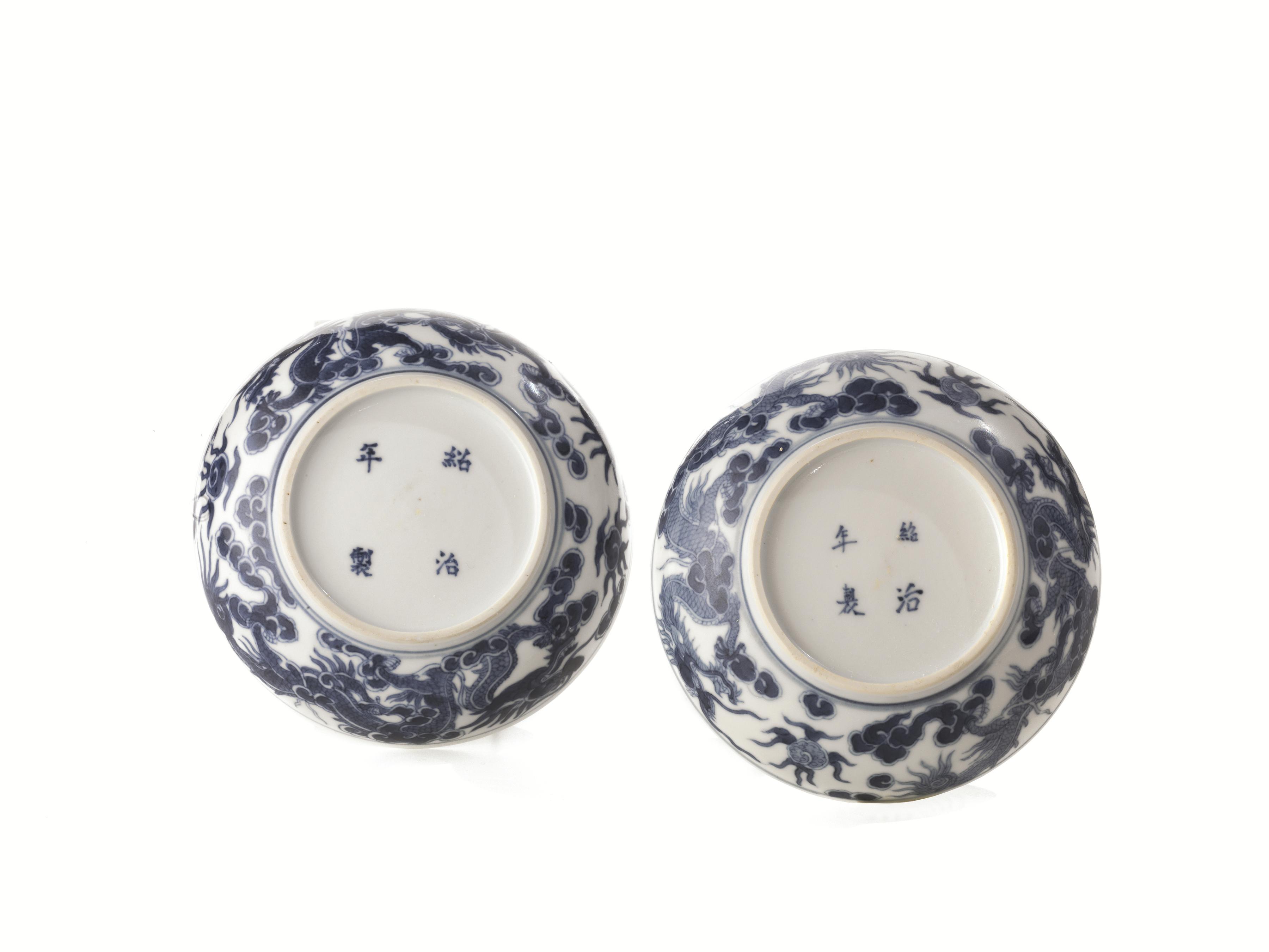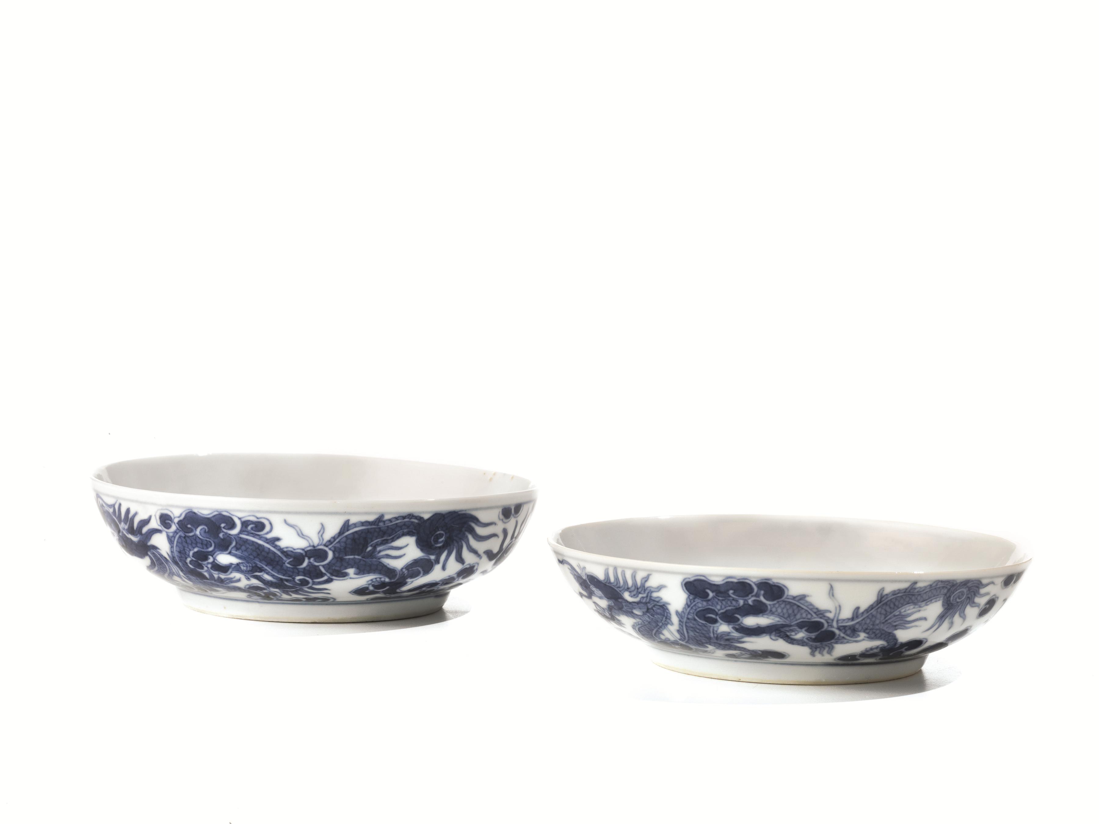 A pair of two white and blue porcelain dragon dish China Qing dynasty