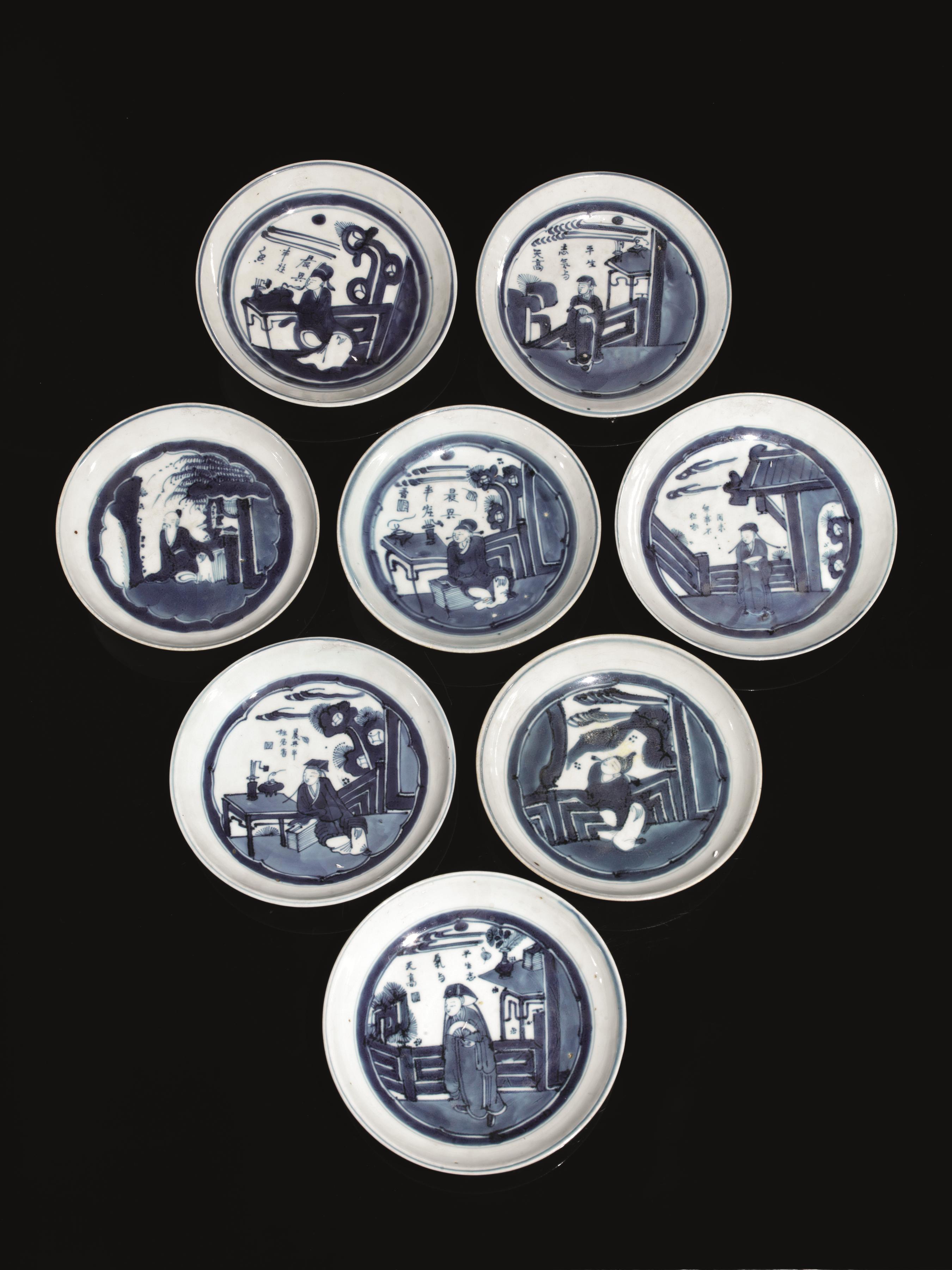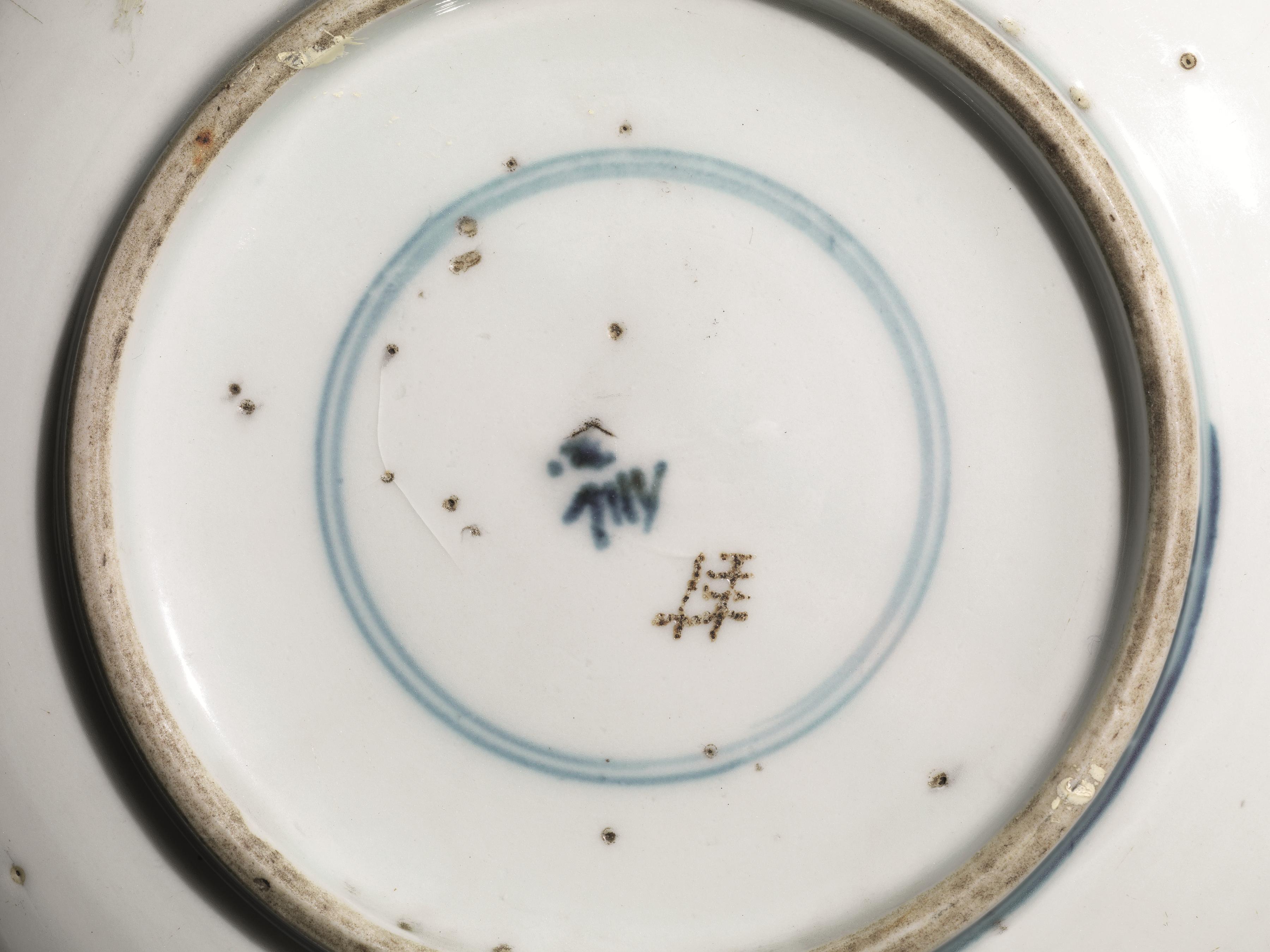 in porcellana bianca decorata in blu cobalto con motivi di saggi e letterati, diam. cm 20 ca