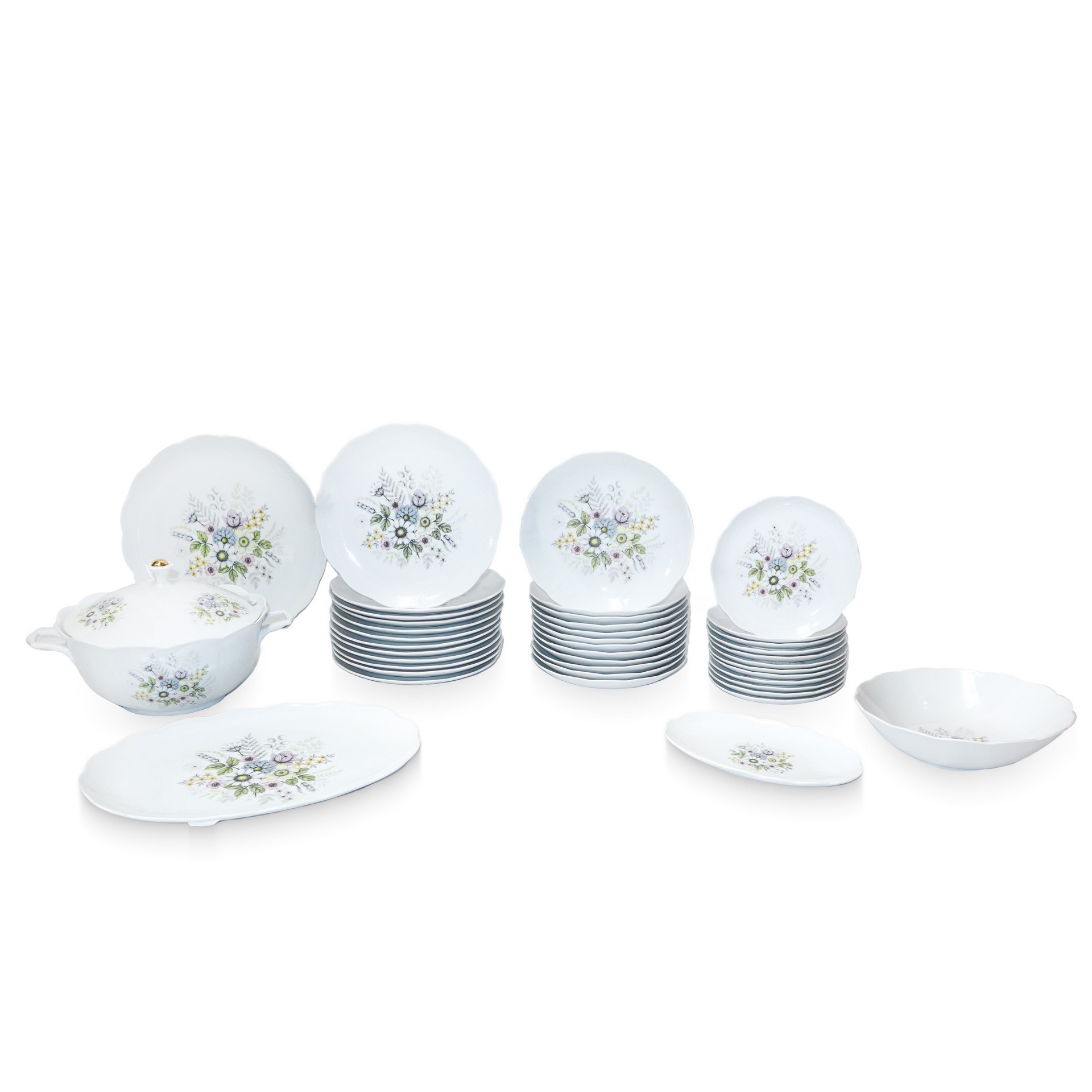 Bavaria Johann seltmann vohenstrauß - Servizio da 12 bianco con bordo smerlato e decoro floreale Servizio composto da: 12 piattini frutta, 12 piatti fondi, 12 piatti piani, 1 zuppiera, 1 insalatiera, 2 piatti da portata ovali, 1 piatto da portata rotondoServizio composto da: 12 piattini frutta, 12 piatti fondi, 12 piatti piani, 1 zuppiera, 1 insalatiera, 2 piatti da portata ovali, 1 piatto da portata rotondo